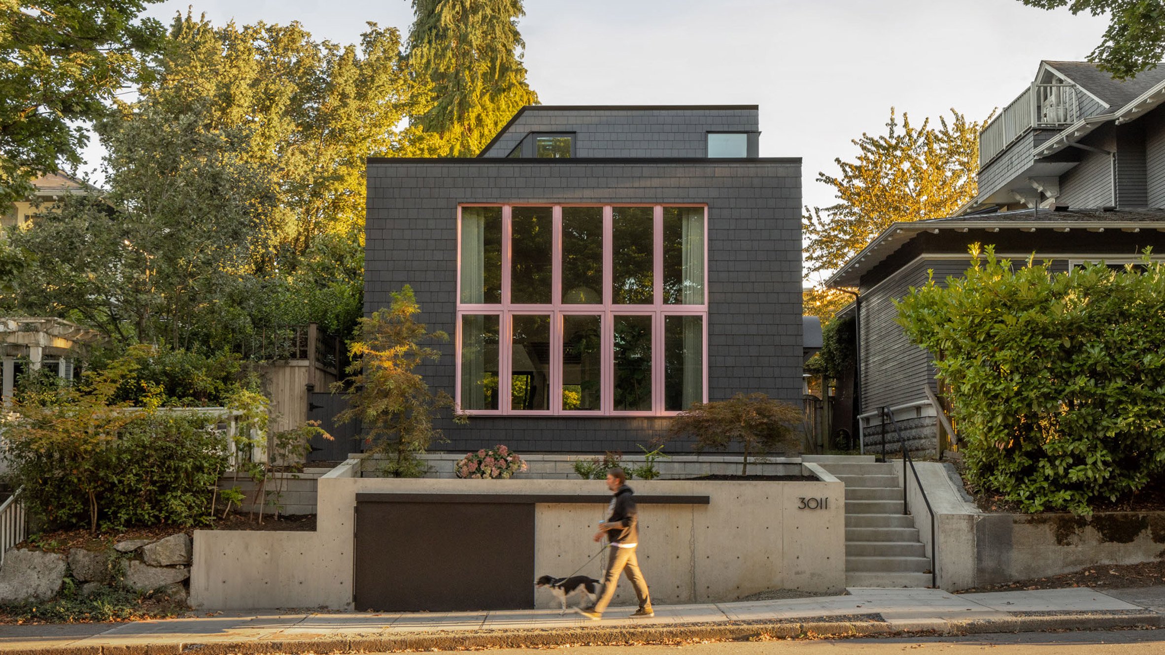 La fachada del norte se establece como una calle, caracterizada por una gran ventana rodeada de tejas de fibra de vidrio gris carbón, un guiño económico al cedro original del edificio.