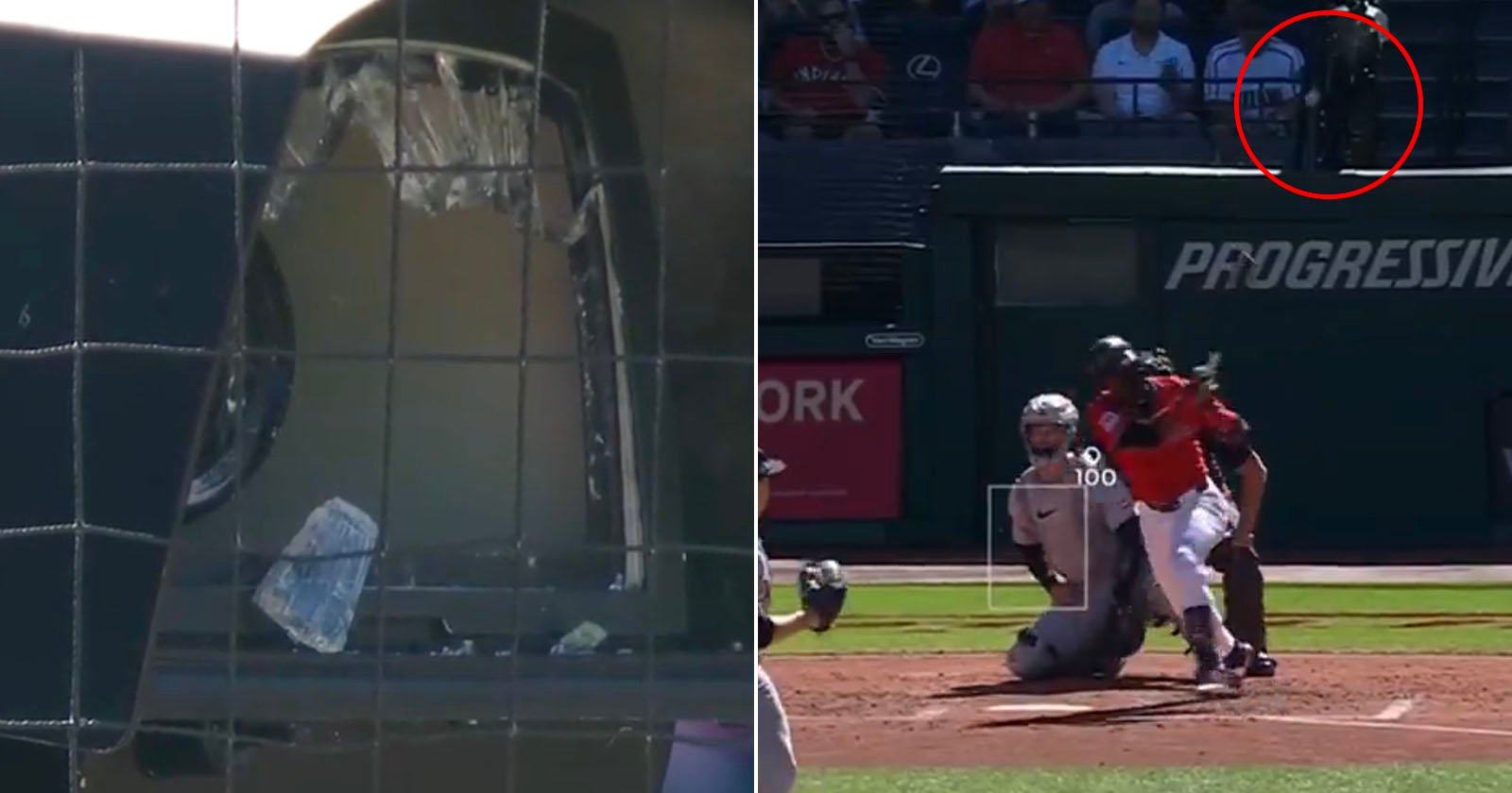 Un vaso de la lente rota aterrizó en la pista de advertencia detrás del plato, lo que provocó que la tripulación de la tripulación de Cleveland los campos de progreso lo limpie.