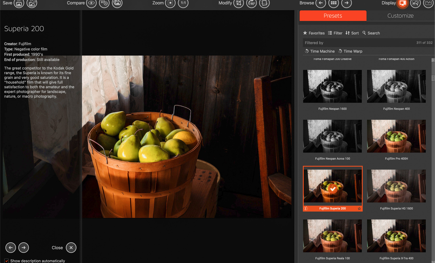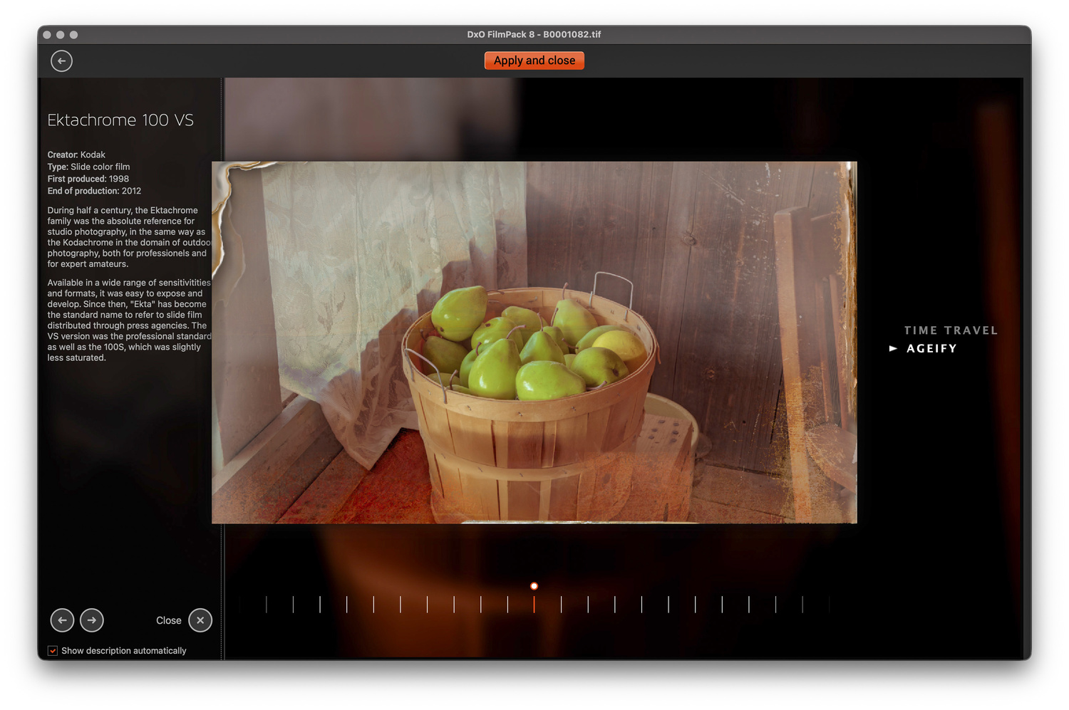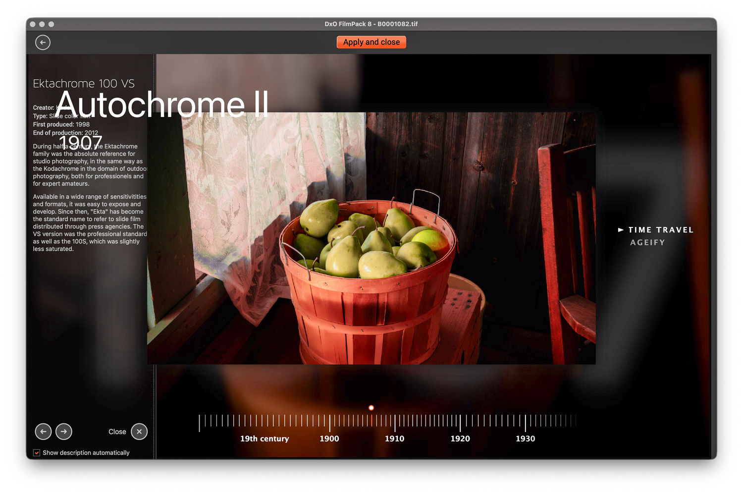 El primero es el viaje en el tiempo, un control deslizante que permite a los fotógrafos tomar una de sus imágenes a través de todas las épocas, existencias de películas y cámaras que abarcan 200 años de historia de fotografía, descubriendo cómo se vería su imagen si se hubiera creado utilizando las mismas herramientas y procesos químicos que los utilizados por Nicéphore Niépce y Louis Daguerre a principios de los 1800, hasta las stocks de 35 mm de 35 mm, FuJifilm y Kodak. Cada paso del control deslizante, los fotógrafos pueden dar un aspecto de realidad periódica, que incluye películas, cambios de color y degradación de la realidad, todo basado en el género de la película que define cada época. Esta es una forma intuitiva de traer narración histórica al proceso de edición.