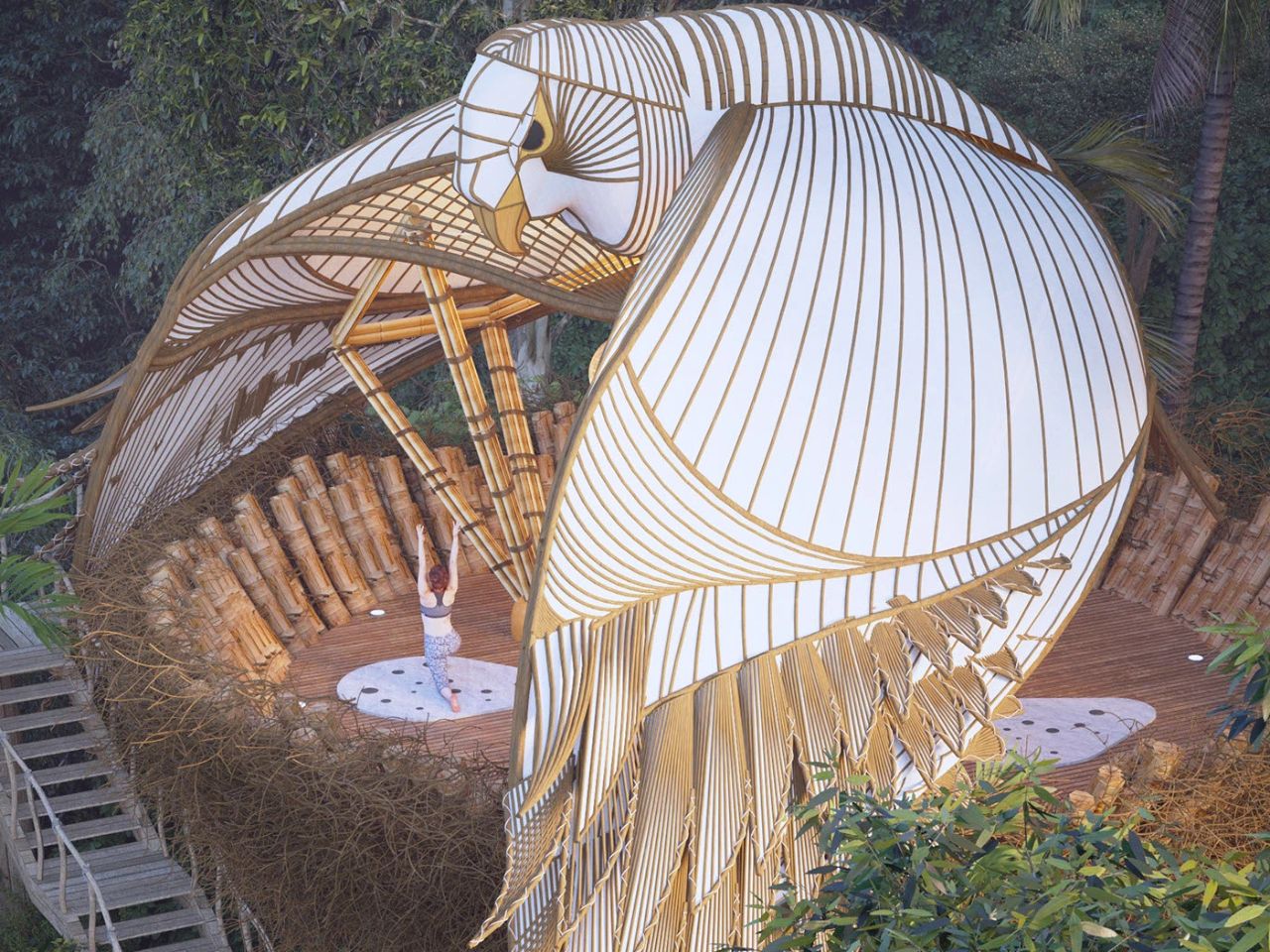 La cubierta de yoga de bambú es una estructura que no solo acomoda el yoga, sino que también la eleva a un sentido, casi un encuentro espiritual. Este diseño se encuentra entre las plantas verdes y encaramado en el suelo, cuando los nidos colgaban en el aire, una oda a la naturaleza, la artesanía y la búsqueda humana de la paz interior.
