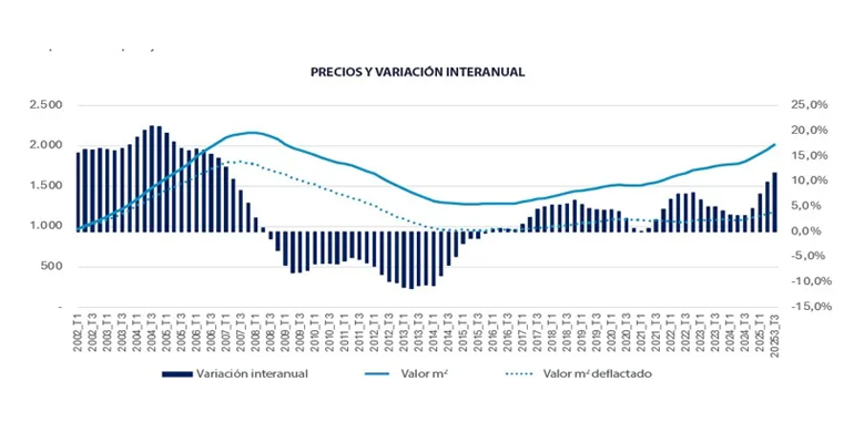 Conjunto Requisito máximo de nivel posterior a la hoja En el tercer trimestre de 2025, las ofertas limitadas consolidaron la fase ascendente del mercado residencial español. Según estadísticas olvidar IMIE Mercado localEl valor promedio de la nueva vivienda publicada hoy ha aumentado 11.7% – La edad es simbólica y En realidad 8.6%descuento inflación. La escalada es relativa a la aceleración en el cuarto anterior.
