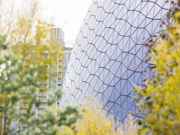 La fachada «Pearl of the East» contiene 27,000 paneles de aluminio, usando solo dos formas diferentes diseñadas, el brillo de cobalto a plata está en la luz cambiante.