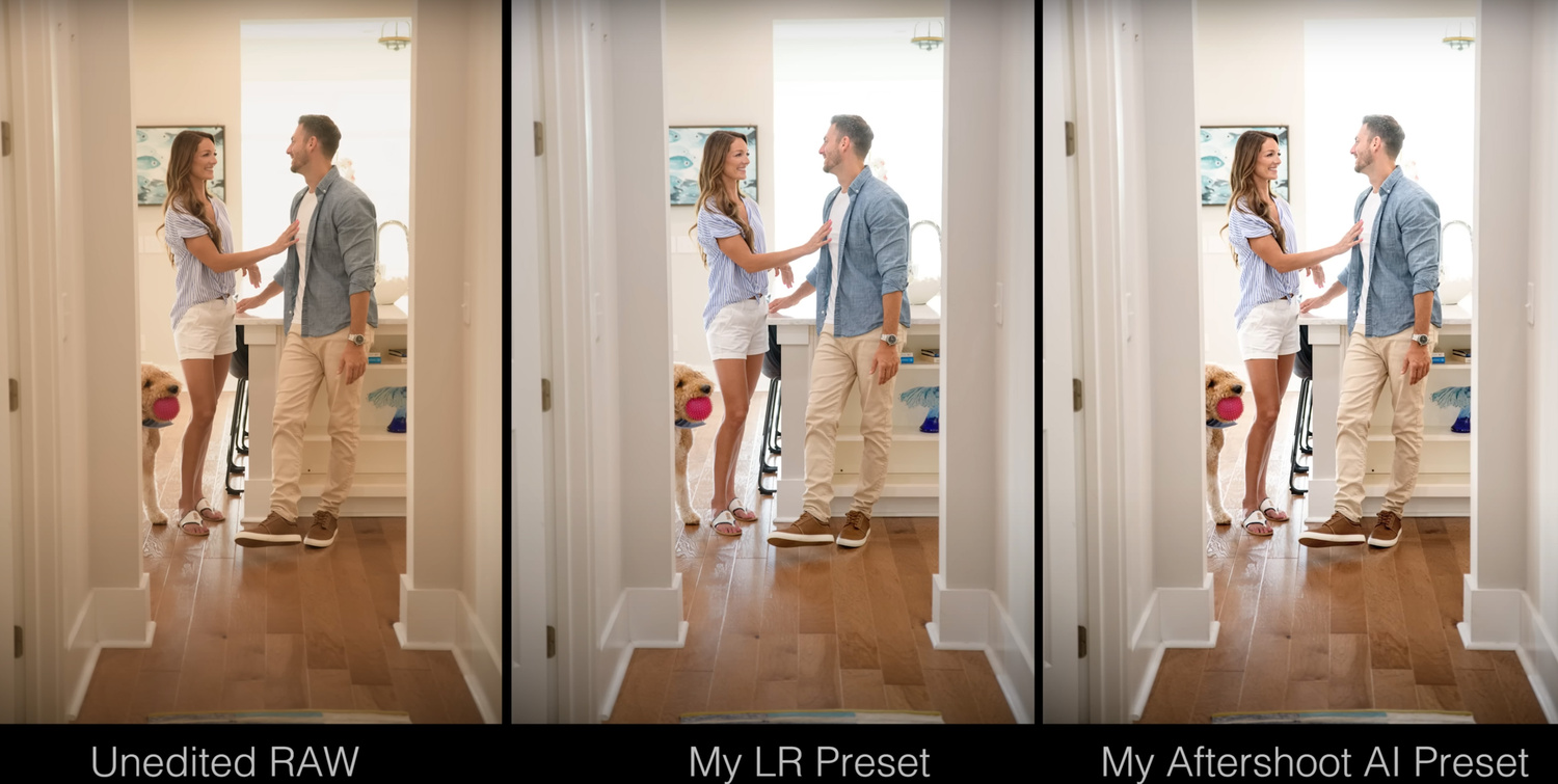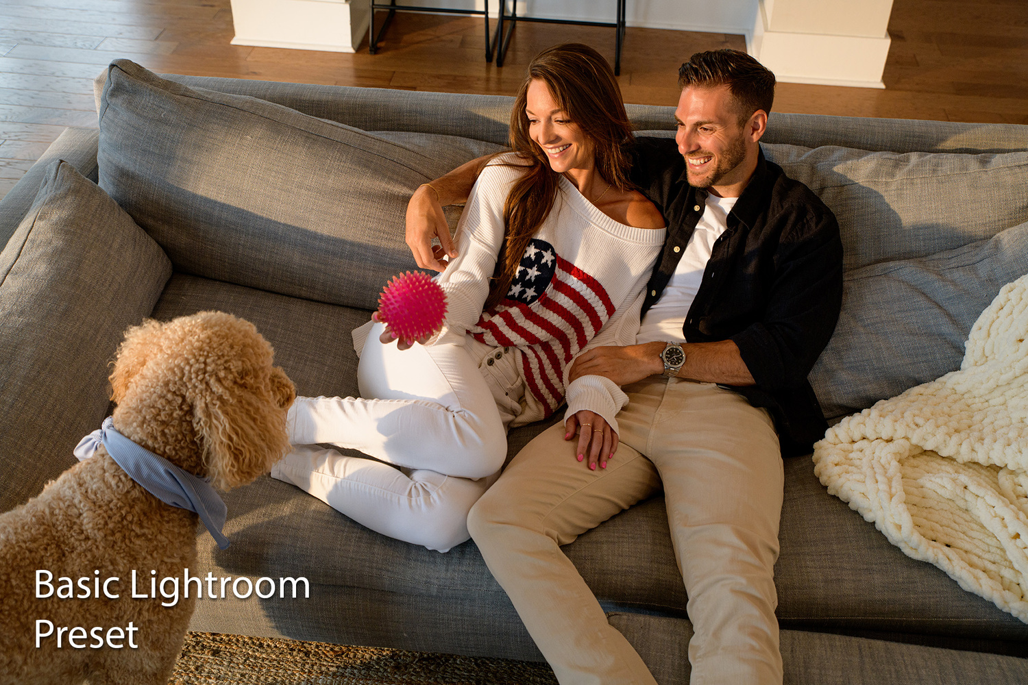 La mejor manera de ver mi personal es ver el video de arriba, pero para aquellos que les gusta ver los resultados en el formato del artículo, he publicado algunas imágenes delantera y posterior aquí. Para disparos editoriales o de estilo de vida como este, me gusta usar mi Lightroom PERT, denominado «estilo de vida». Lo diseñé para levantar muchos tonos, empujar los reflejos un poco más brillantes de lo habitual, aumentar el contraste y establecer un equilibrio de blancos bastante neutral. Sin embargo, como puede ver a continuación, la imagen de esta sesión interior todavía se ve un poco plana y el balance de blancos es demasiado estéril. Una vez que apliqué el perfil de IA de los preajustes de estilo de vida de la IA de la AI de respaldo, el contraste y el color mejoraron significativamente. La imagen editada con reacción aún conserva mi sensación general y estado de ánimo basado en presets de estilo de vida, pero ahora es mejor.