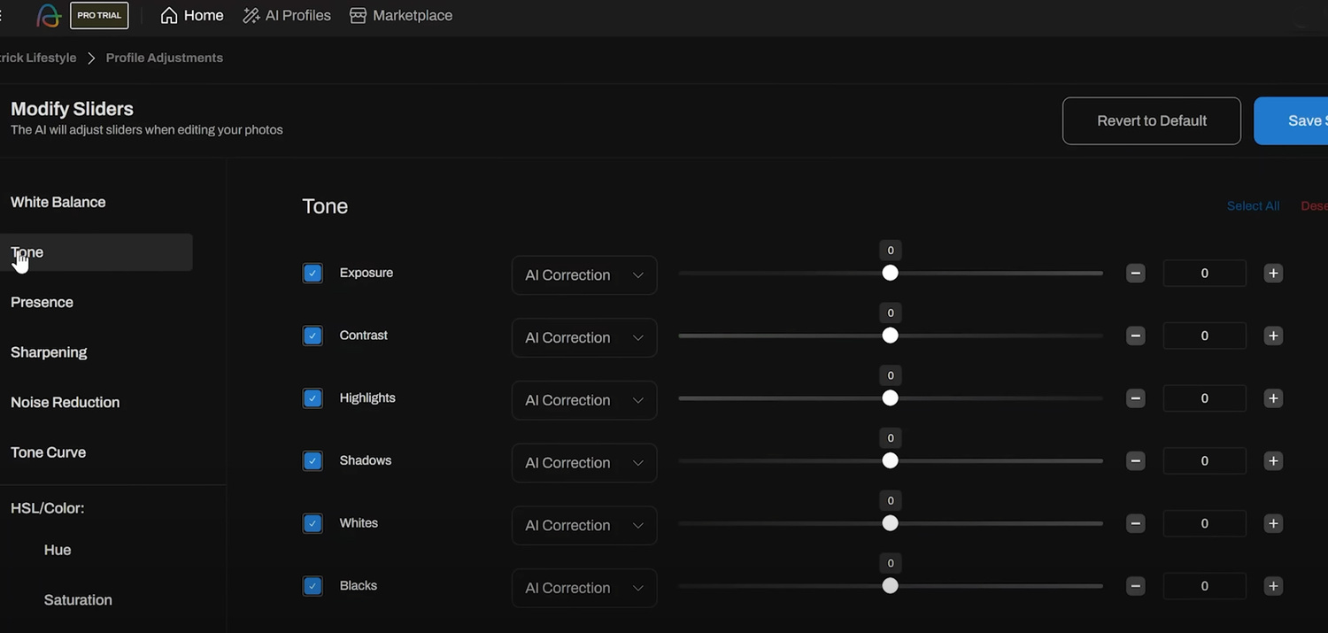 Además, si encuentra que su perfil de IA instantáneo todavía le está dando un resultado diferente al lugar donde lo desea, puede ajustar fácilmente todo el perfil utilizando el control deslizante de ajuste de perfil. Puede ajustar la configuración ajustando las correcciones de IA o configurando manualmente los cambios de tono.