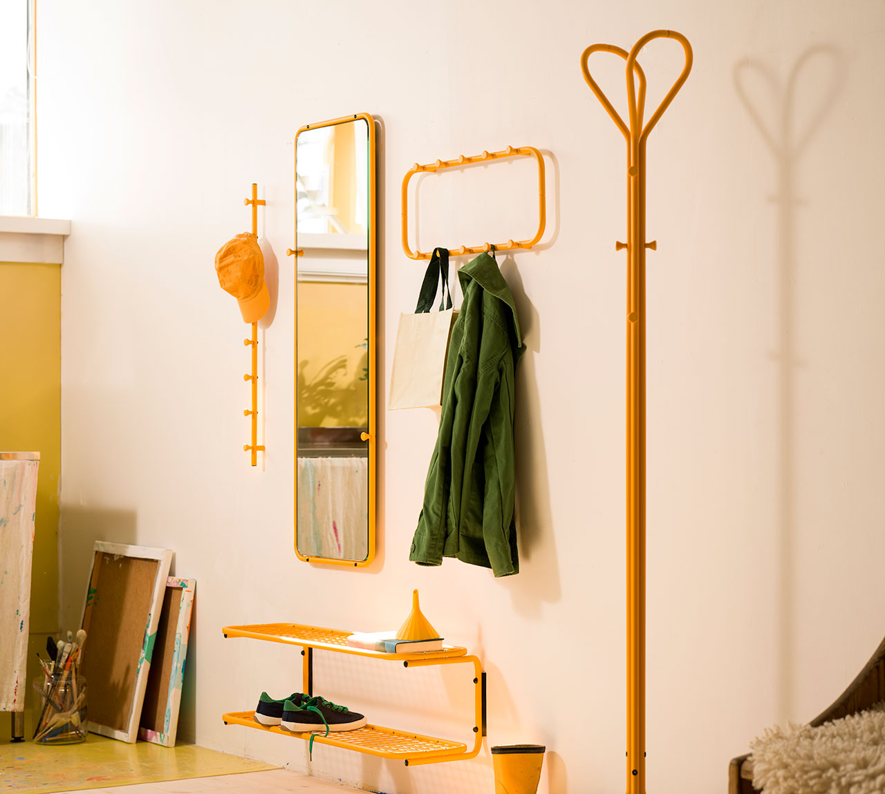 Cada pieza de la nueva serie clásica equilibra el entretenimiento de la utilidad. El soporte de chaqueta independiente se eleva con una parte superior ventilada, inclinada, mientras que el espejo de la pasarela sirve como solución de almacenamiento, llaves o sombreros con ganchos integrados. Un riel de uñas delgado, un gancho y un bucle que recuerda a una rejilla de sombrero de los años cincuenta, y dos tamaños de perillas montadas en la pared mantienen los pisos desordenados caóticos mientras agrega simplicidad gráfica a las paredes. Fiel a los valores de la compañía, cada pieza está diseñada para durar piezas reemplazables y estructuras reflexivas para garantizar la longevidad. Estos objetos funcionales terminan con el icónico «amarillo del sol» de Essem y se convierten en el foco de la alegría, e incluso el espacio más efectivo puede ser más brillante.