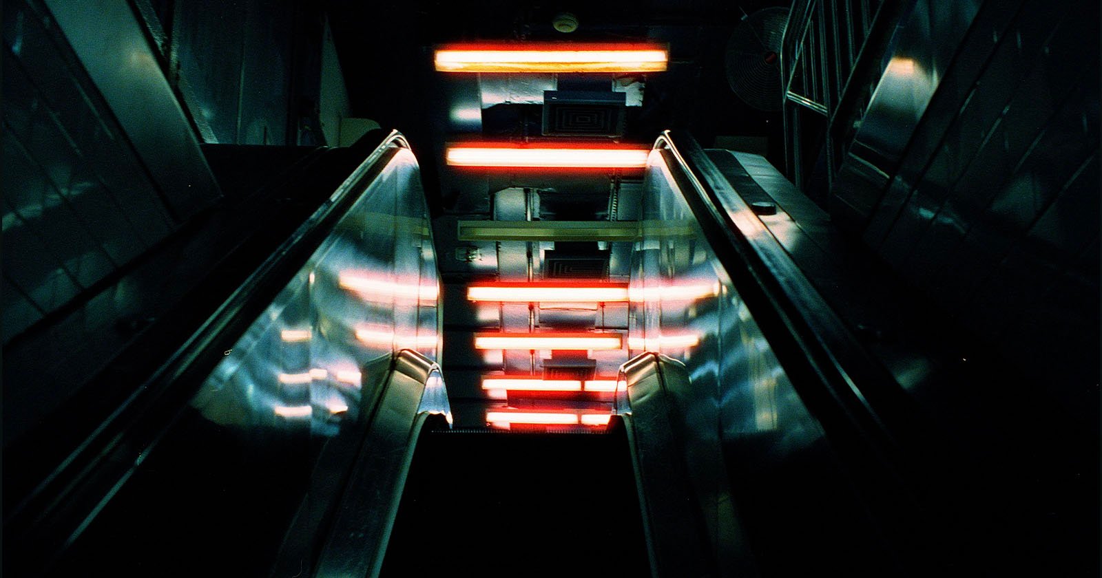 La escalera mecánica aterrizó en un área oscura, iluminada por una fila de luces fluorescentes rojas en lo alto. La imagen tiene una sensación cinematográfica de mal humor y tiene texto en la parte inferior, que es la cámara Voigtländer Bessa R2 y la película Cinestill 800T.