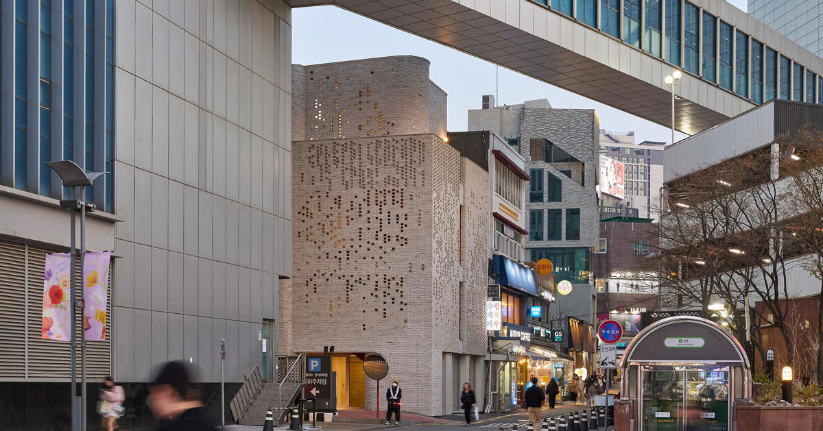 Históricamente, Sinchon se ha asociado con la cultura juvenil, la música en vivo y los negocios independientes, pero con el tiempo, estas cualidades han disminuido con la gentrificación y el dominio de las grandes franquicias comerciales. El proyecto no solo está diseñado para estabilizar la estructura, sino también para volver a involucrar esta historia cultural. El nuevo diseño equilibra consideraciones prácticas con gestos simbólicos. Las paredes de ladrillo perforadas permiten que el edificio se mueva visualmente entre el día y la noche, absorbiendo la luz durante el día y emitiendo un suave brillo después del anochecer. Este doble papel enfatiza la intención del proyecto de combinar la funcionalidad con las referencias culturales.