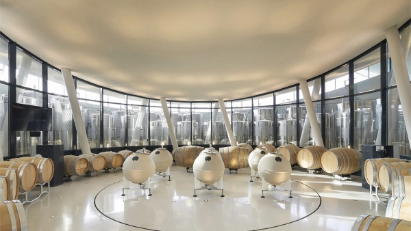 La sala de fermentación subterránea coloca los tanques de acero en un anillo concéntrico alrededor del barril de roble central. La calma y la estabilidad subterránea protege la calidad del vino.