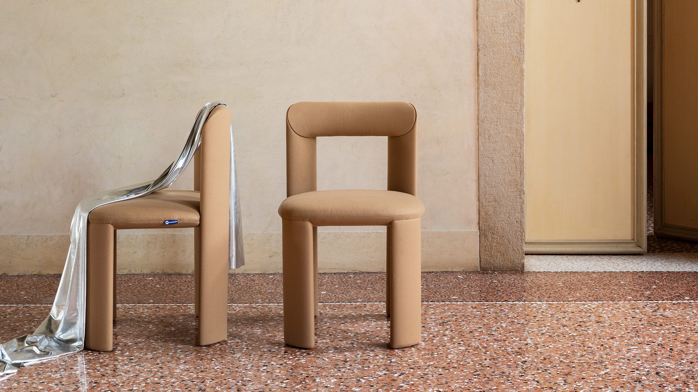 Showroom de Dezeen: En este cojín completo, el esquema juguetón se combina con textiles estampados en negrita Silla De marcas italianas Miniformes y diseño de estudio huevos.