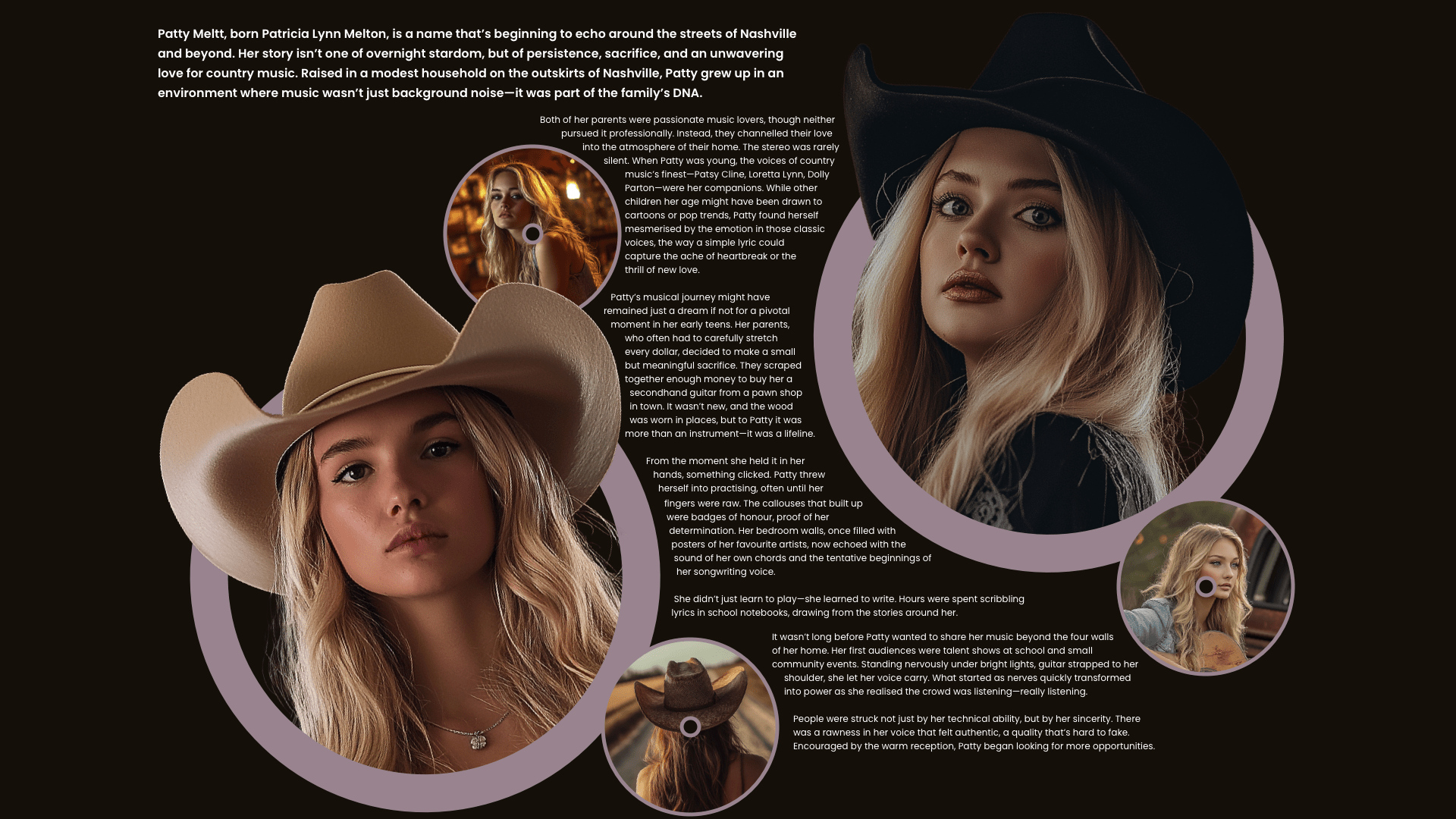 A Patty Meltt le encanta empujar los límites de la música country, y quiero hacer lo mismo con su diseño de biografía. Planeo fluir texto entre dos acentos de luz, donde los elementos se superponen y una parte de la imagen se desborda desde el contenedor para crear profundidad.