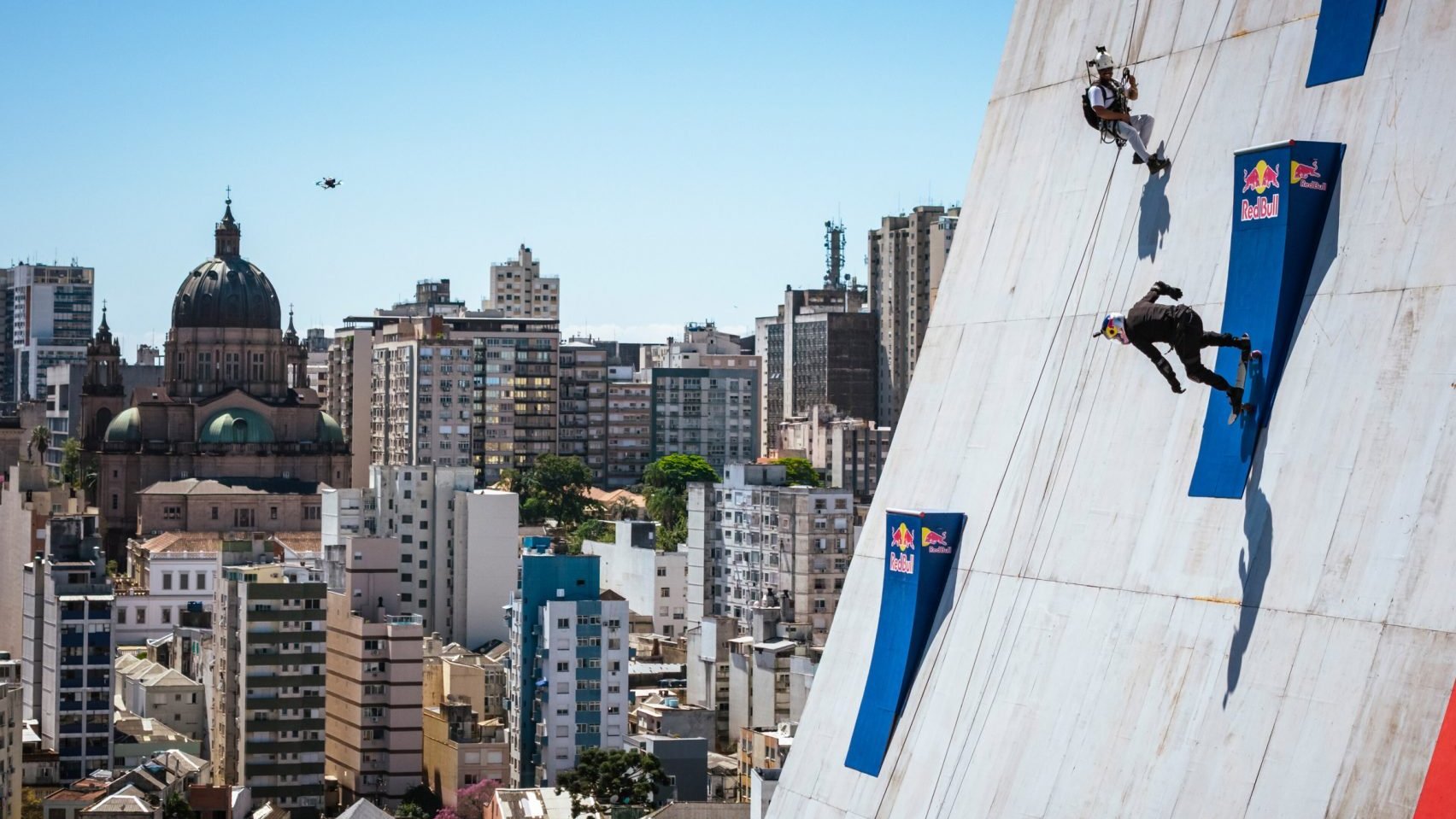 Bull Red y Prada Cubriendo un lado de los edificios modernistas Brasil Con enormes rampas de skateboard, se puede hacer una disminución récord a través de skatboards locales Sandro Dias.