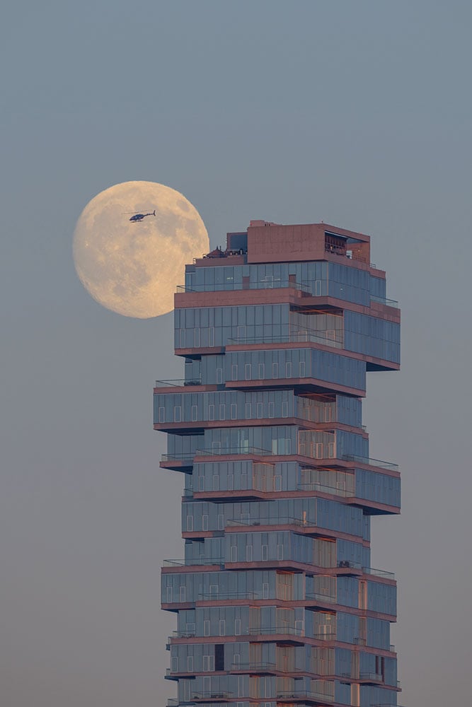 Mientras tanto, el fotógrafo Mike Carroll capturó un avión conjunto volando aprobar Super Moon. El despertar del avión hizo que pareciera que la luna en sí estaba brillando. La noche anterior, Carol capturó los satélites naturales de la Tierra, saliendo detrás del edificio Jenga en Nueva York.