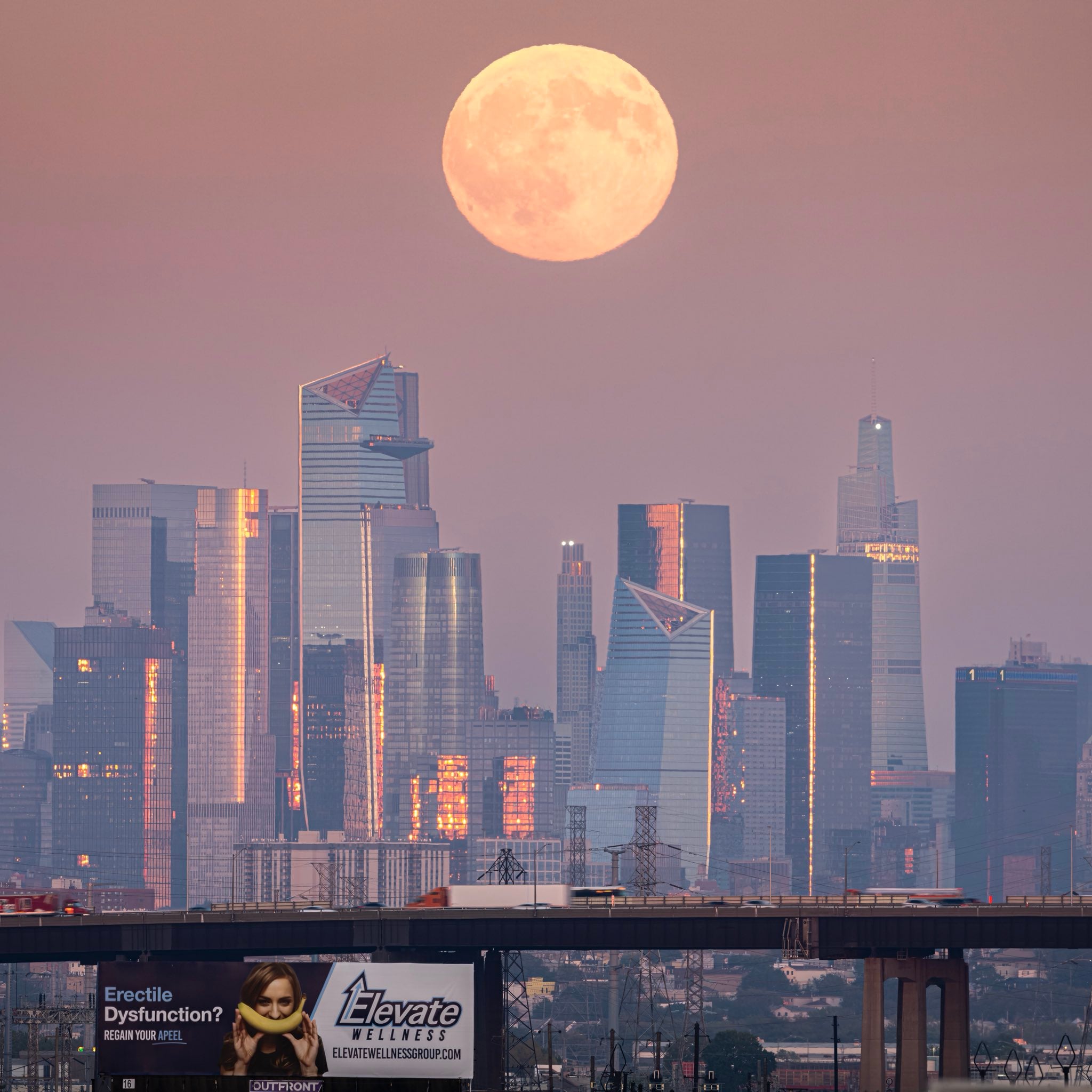 El lunes por la noche, Hershorn disparó la increíble superluna de la cosecha detrás de la Estatua de la Libertad y el horizonte de Brooklyn. El día anterior, recibió “98% de luna de cera iluminada” que se elevaba detrás de la plataforma de observación de Edgenyc.