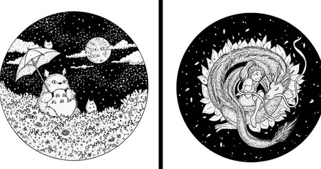 Studio Ghibli mostrado en dibujos circulares a tinta