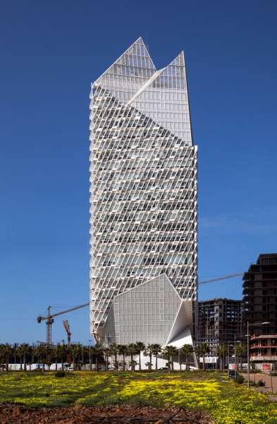 En lo alto, la torre CFC está rematada por una corona articulada que acentúa la silueta y se destaca contra el horizonte después del atardecer.