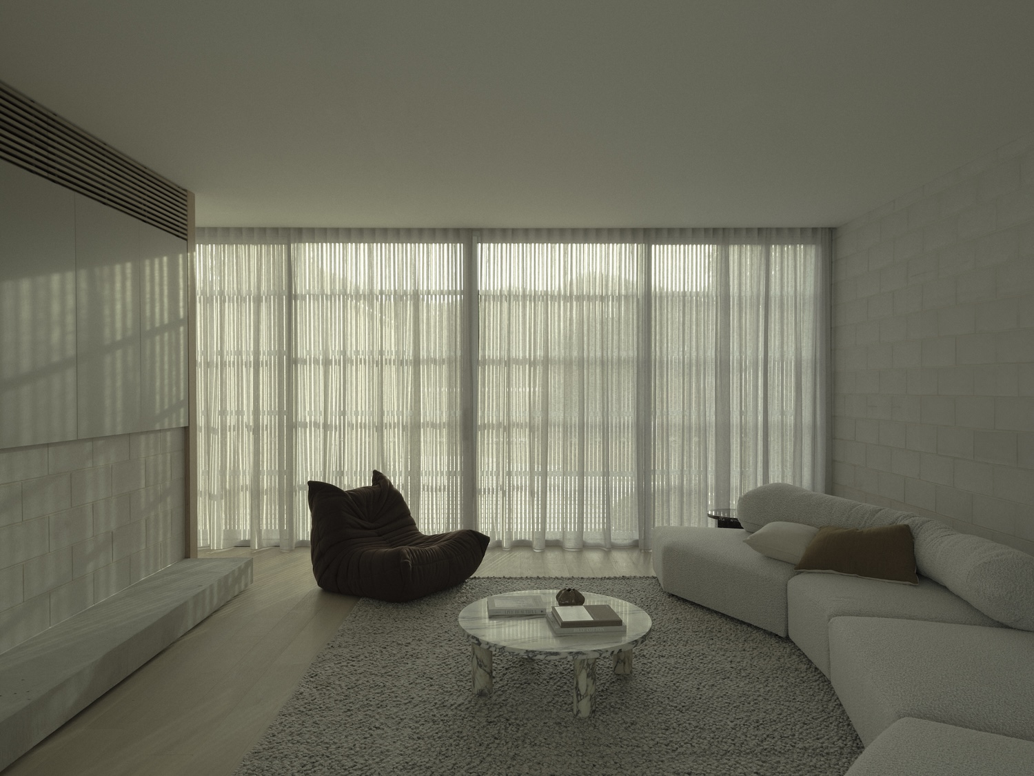 Los acabados interiores elegidos para suavizar la sólida estructura de mampostería demuestran una cuidadosa coordinación de materiales entre superficies arquitectónicas duras y elementos táctiles que incluyen madera, textiles y posiblemente piedra, introduciendo calidez sin comprometer la durabilidad esencial de la casa. Este enfoque refleja el diseño residencial australiano contemporáneo, priorizando materiales que puedan resistir la exposición a la sal costera y la intensa radiación ultravioleta, manteniendo al mismo tiempo la comodidad del hogar.