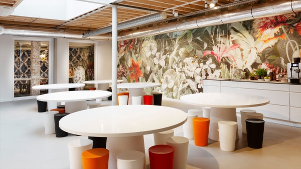 La mayoría de las áreas de la oficina están cubiertas con papel tapiz expresivo, que aporta color y movimiento al interior.