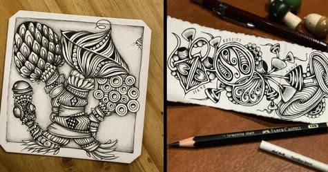 «Los dibujos originales de Zentangle siempre se crearon en mosaicos cuadrados de 3,5 pulgadas (8,9 cm); la intención era que los mosaicos formaran patrones más grandes cuando se colocaran juntos. Y se dibujaron en blanco y negro».