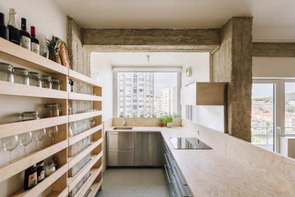 La cocina y la sala de estar comparten un área larga y continua de aproximadamente 28 pies. La luz natural entra a través de aberturas nuevas o ampliadas, lo que hace que los planos largos y estrechos parezcan menos restrictivos.