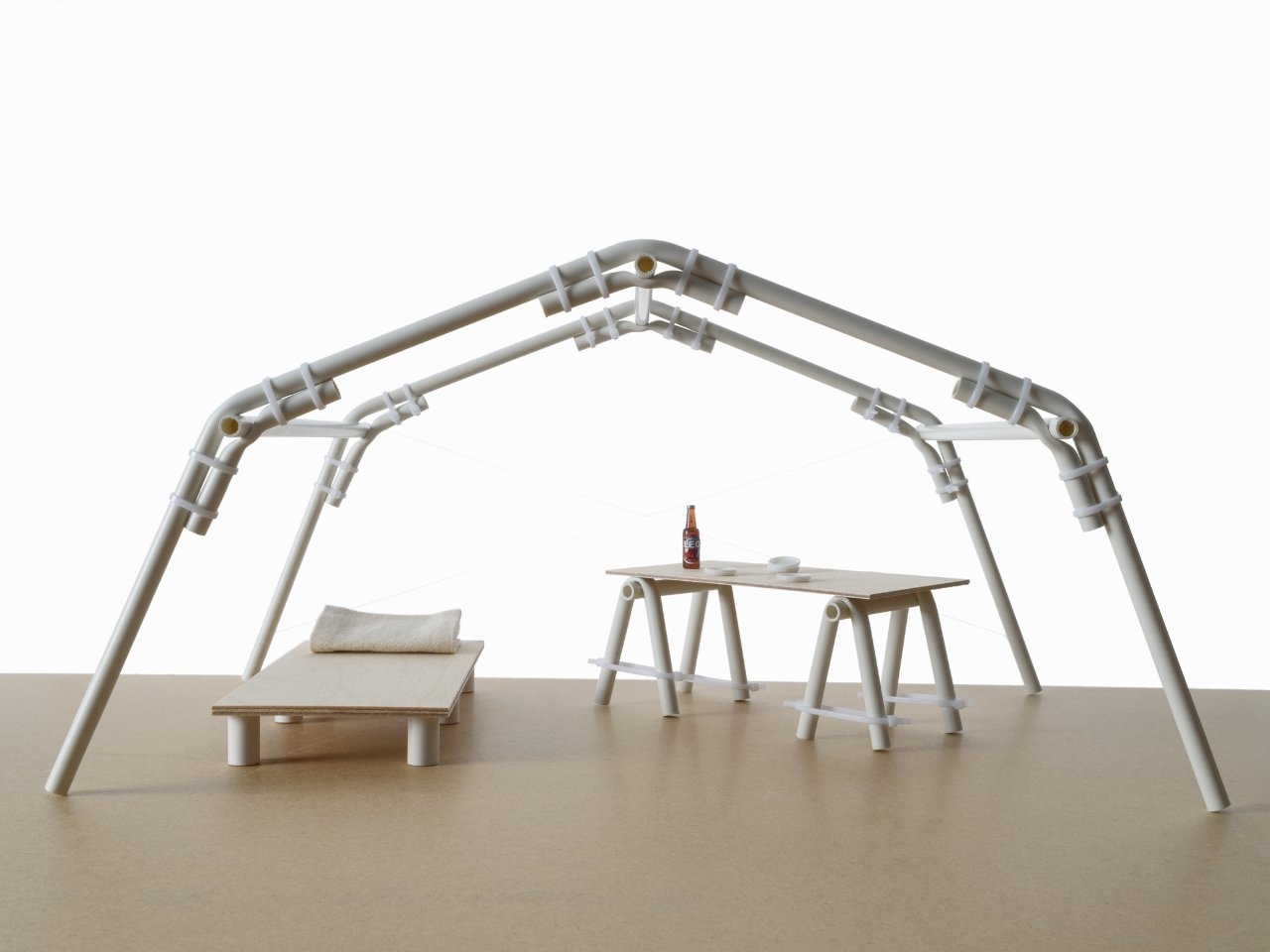 Esto es algo que la mayoría de nosotros olvidamos de las tuberías de PVC. Se puede cortar con herramientas sencillas y se puede remodelar fácilmente una vez que se ablanda con el calor. Marx tomó esta propiedad básica y la transformó en un sistema completo de ensamblaje para viviendas de emergencia. En lugar de buscar juntas en T, codos y piezas de esquina, simplemente puede calentar el tubo y doblarlo en la forma que necesite. Las bridas para cables, que Marx llama clips flexibles, son todo lo que necesitas para mantener todo unido. Eso es todo. Tuberías y bridas dobladas.