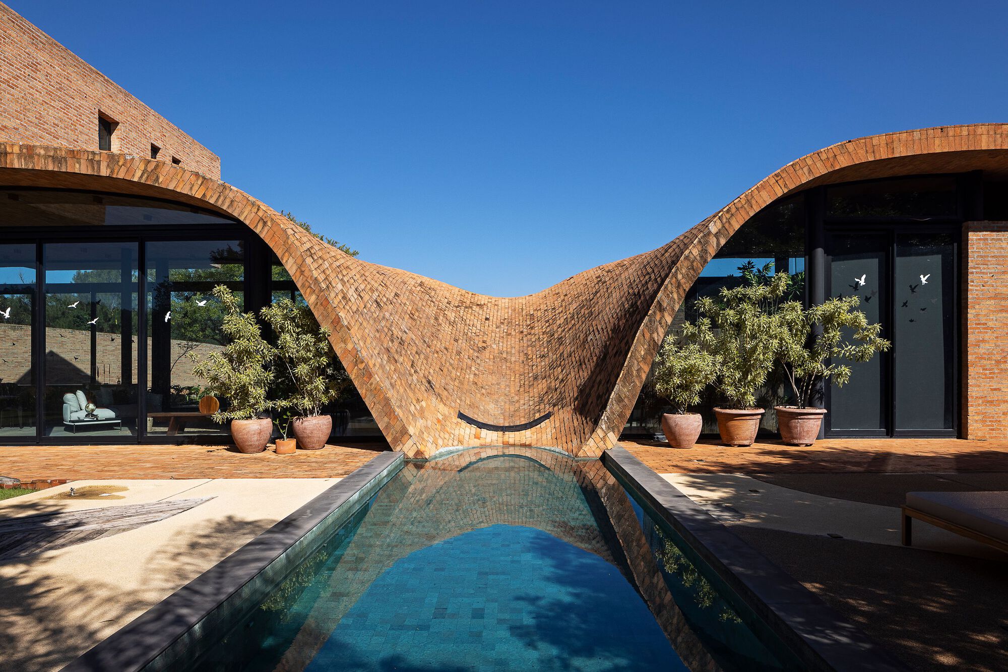 El pronunciado techo de ladrillo con su prominente curvatura es uno de los elementos centrales del proyecto. Además de marcar estéticamente la vivienda, también actúa como recogedor del agua de lluvia, dirigiéndola hacia la piscina. Las placas de piso de doble piel y los amplios aleros trabajan juntos para lograr un enfriamiento pasivo del ambiente, eliminando la necesidad de aire acondicionado.