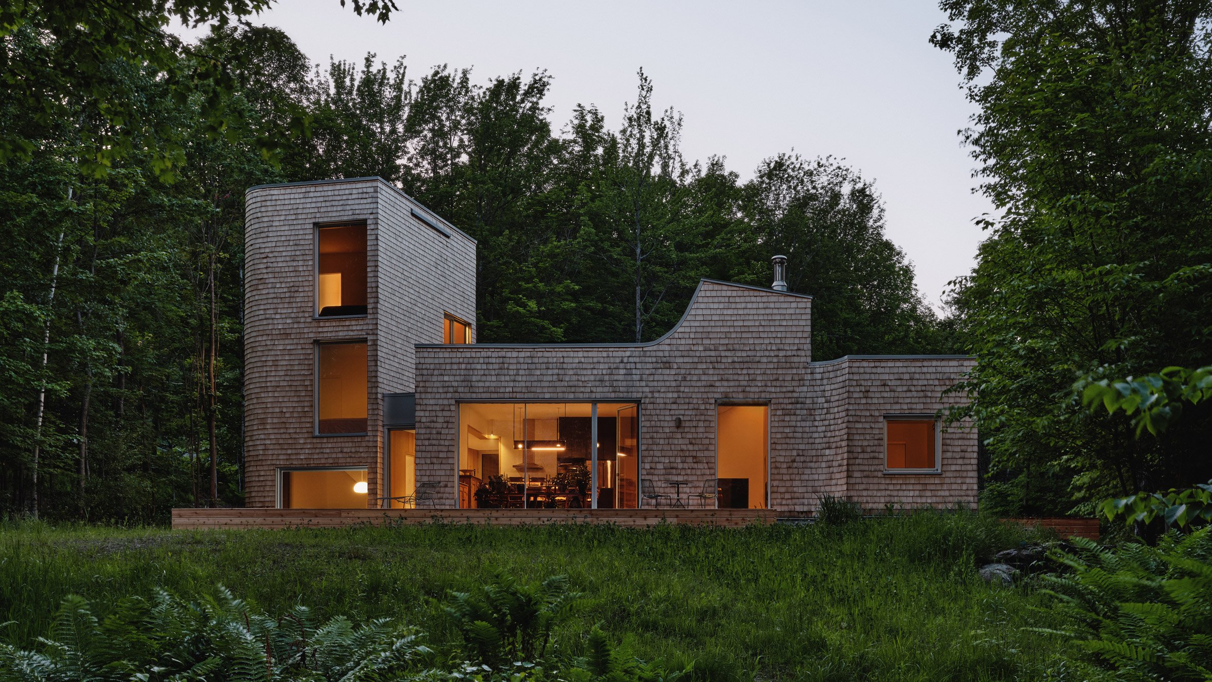 El estudio canadiense Oyama y Julia Manaćas Architecte diseñaron Waterhouse, bosque La casa está cubierta de madera. Herpes Integrado en los espacios abiertos naturales de Sutton, Quebec.