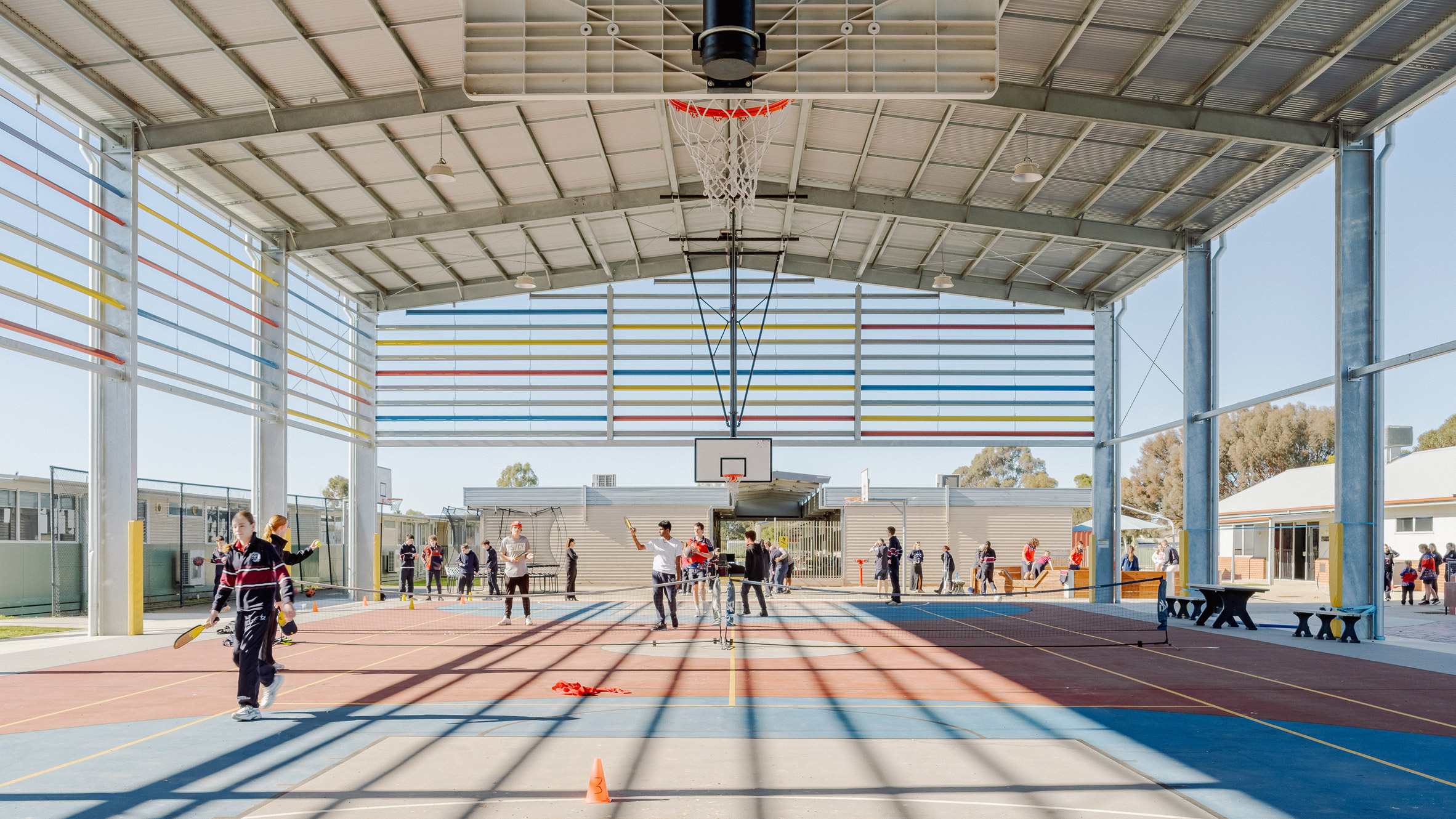 El estudio de arquitectura australiano WHDA actualiza Swan Hill Vocational School victoriaagrega un acero– Una cancha deportiva enmarcada con coloridos parasoles que sirve como su «centro social catalizador».