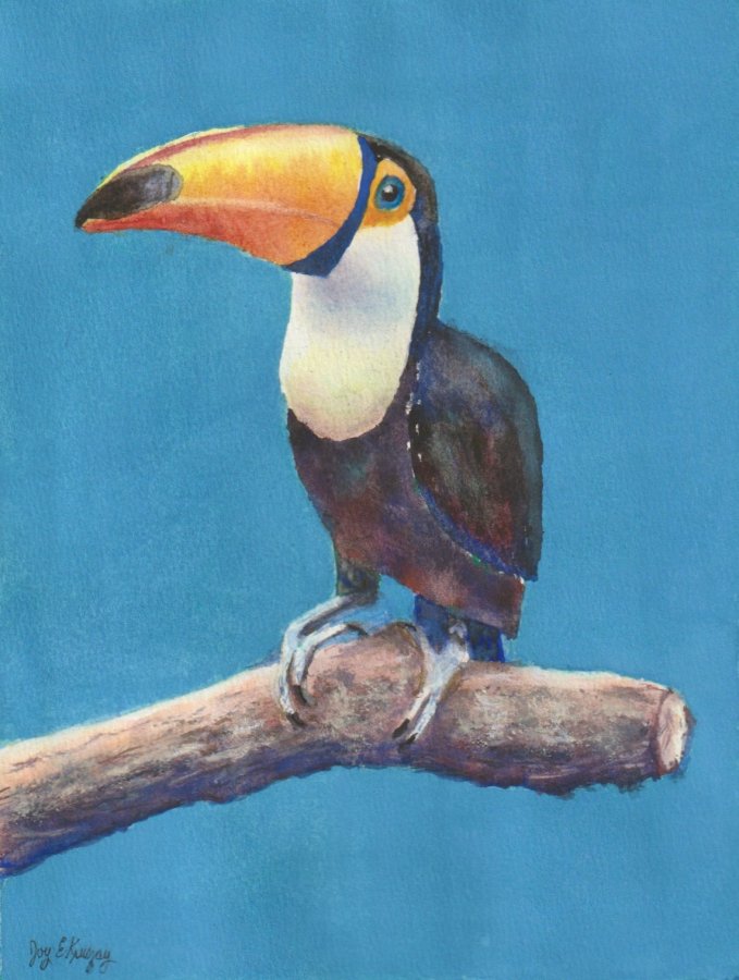 Esta es una pintura de acuarela que mide 8 x 11, realizada en una prensa en frío Baohong 140. Este Toco Tucán se completó como parte de otro desafío del foro. Originalmente, iba a hacer que el cielo de fondo fuera de un color azul cobalto pálido y transparente, pero ese color se veía muy veteado en otro papel más barato, y tampoco me gustó cómo se veía en ese papel. Como tenía suficiente azul, apliqué algunas capas para obtener una apariencia suave. Es un color bastante opaco, por lo que generalmente no se recomienda. También «rompí» otra regla de la pintura con acuarela con Ivory Black. Se mezcla con otros colores de las plumas del ave. En lugar de limitar mi paleta como lo haría normalmente, utilicé una variedad de colores para pintar las ramas, así como las sombras del pájaro y su pico.