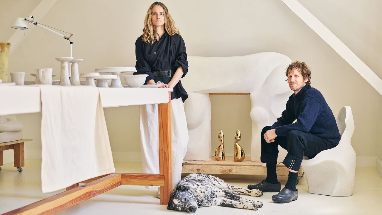 Las instalaciones de yeso específicas del estudio son otro ejemplo de esta evolución continua. MacDonough, un ingeniero de formación con experiencia en escultura y fotografía, se unió como director de interiores a principios de este año, aunque su apoyo informal se remonta a 2022, cuando ayudó a solucionar problemas en la ejecución de un espejo de 8 pies de altura en el stand de Design Miami de Emma Scully. “Poco a poco, surgieron proyectos para los que Simone necesitaba asesoramiento estructural”, dijo McDonald sobre su modelo complementario. «Admiro su capacidad para ver formas y comprender cómo encajan en los entornos de vida». A menudo traduce sus modelos hechos a mano en relieves a gran escala, como el marco ondulado de la chimenea en el estudio de arriba que el diseñador de interiores Sebastian Zuchowicki creó para un proyecto de Brooklyn; o el techo topográfico que la pareja instaló en su apartamento de NoHo, que presenta cortinas en forma de estalactitas que inspiraron la lámpara de araña que se estrenará a principios de 2026.