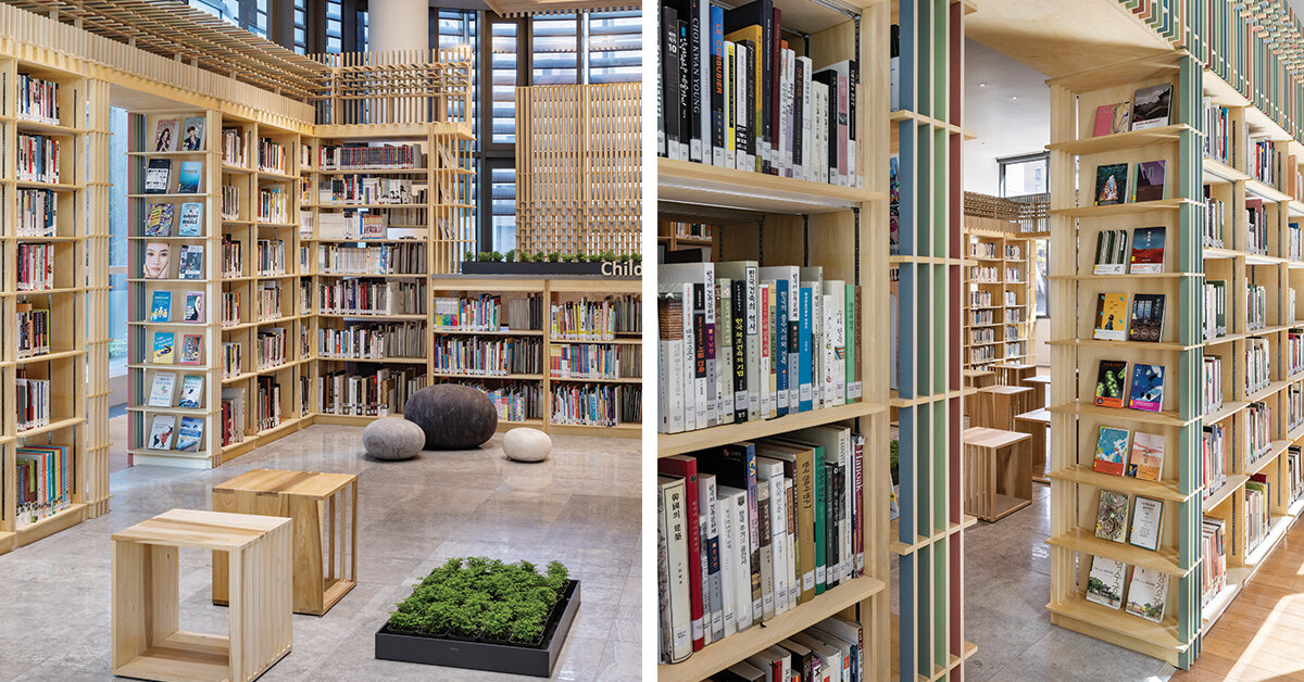 En su diseño se refirieron específicamente al patio cerrado y a los principios espaciales de circulación flexible de la casa coreana. Al disponer las estanterías de madera en un anillo rectangular, se crea un vacío en el medio. Este espacio, junto con la terraza con jardín adyacente, sirve como el corazón inclusivo de la biblioteca, muy parecido a un patio tradicional coreano. Este diseño garantiza que los visitantes puedan conectarse visual y físicamente con la vegetación. Esta fuerte conexión biofílica crea una experiencia sensorial única.