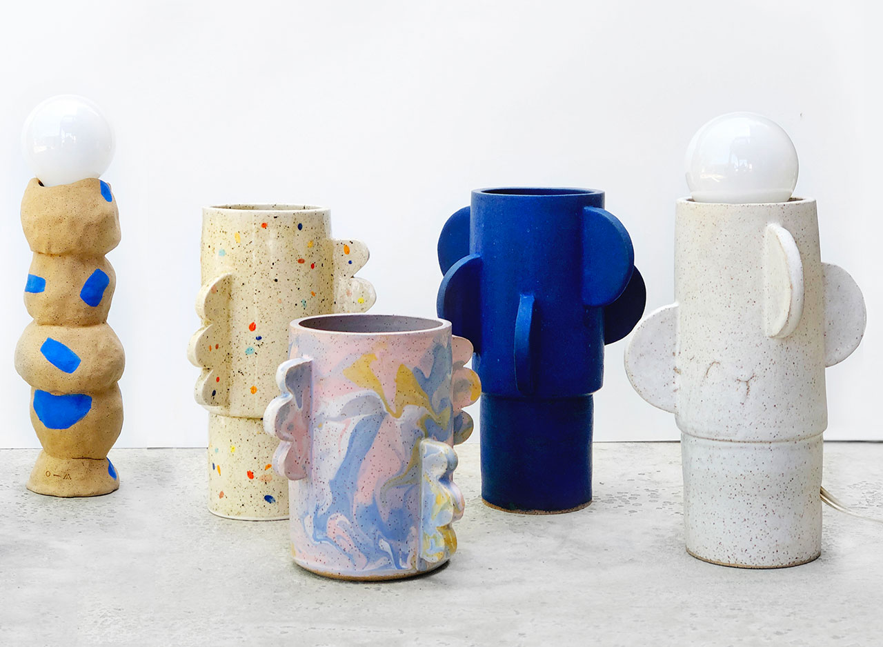 Morfología y flora — Instalación emergente en Slowdown Studio en Los Ángeles en 2022. La obra explora formas escultóricas y de jarrones a través de interesantes combinaciones de esmaltes, colores y texturas. Cada pieza se convierte en un experimento de forma y superficie, que celebra la conexión orgánica entre forma y vegetación.