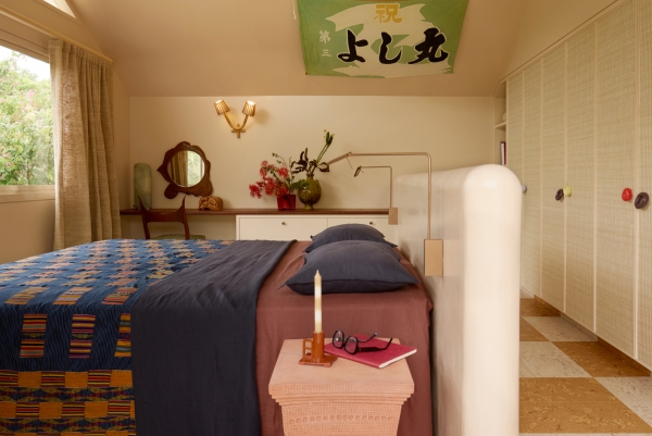 El dormitorio principal ofrece un refugio acogedor en tonos cálidos de caramelo, toffe y crema. Una vez retirado el armario empotrado, una media pared de microcemento de color arenisca hace las veces de cabecero.