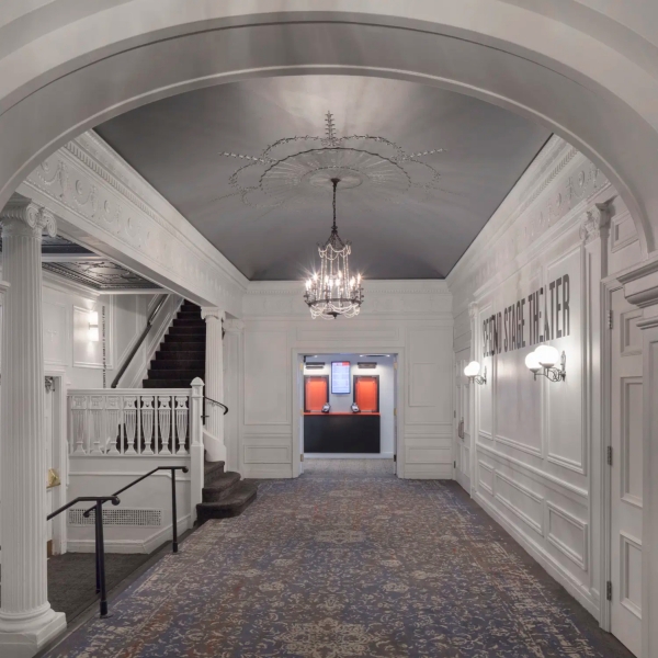 El vestíbulo inferior y la escalera han sido restaurados con toques modernos, como acabados en naranja, que se combinan con la forma original del emblemático edificio.