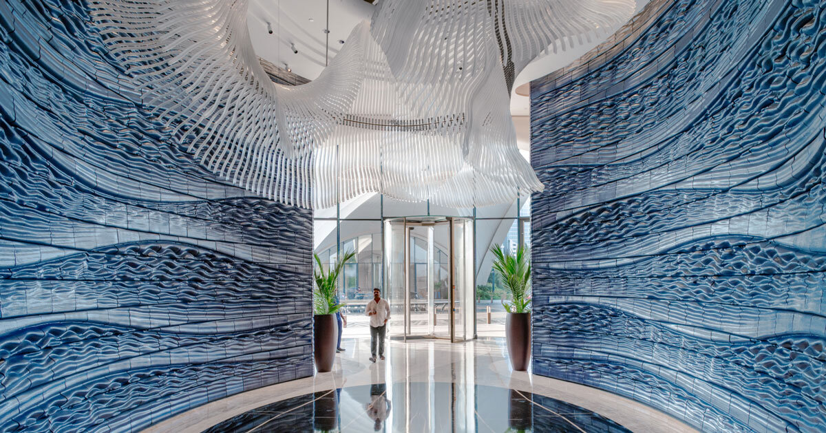 en la entrada dubái Jumeirah Martha’s Arabian Hotel hoteldos grandes productos ceramicos pared hecha de rap de estudio Definir la experiencia espacial de la llegada. Titulado «Viaje Azul» Instalar explorar potencial impresión 3D Cerámica para superficies de construcción, que combina el diseño computacional con la precisión del material.
