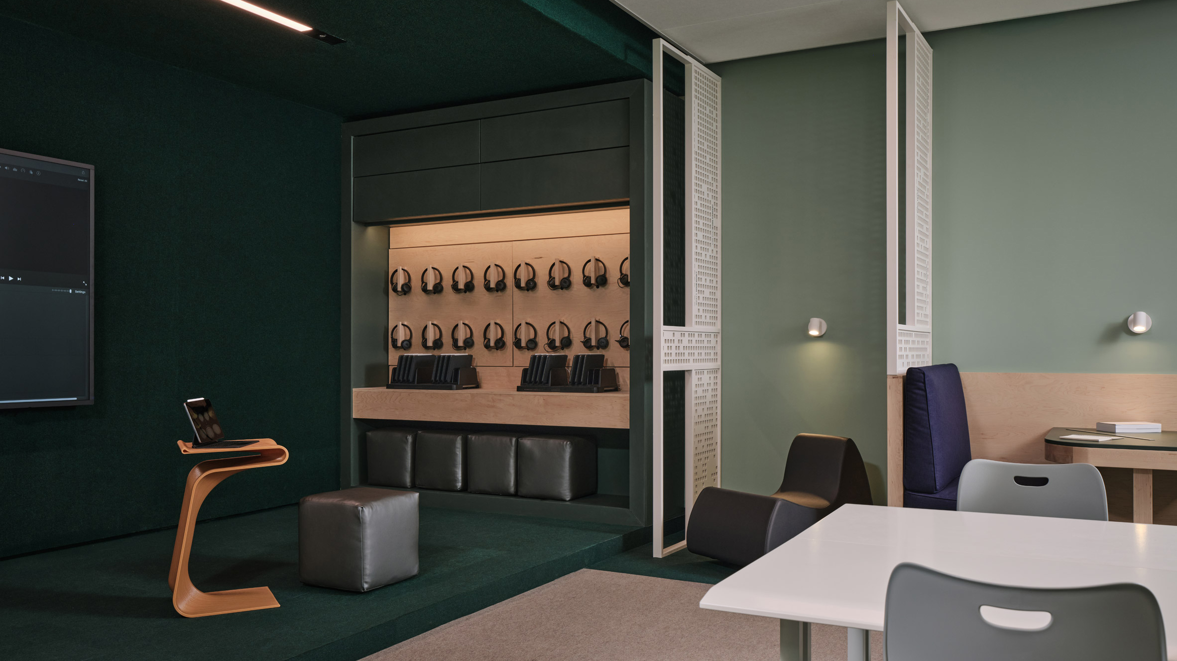 El espacio y su mobiliario están decorados en relajantes tonos verdes y azules, y las paredes están revestidas con un tejido fonoabsorbente fabricado 100% poliéster reciclado.