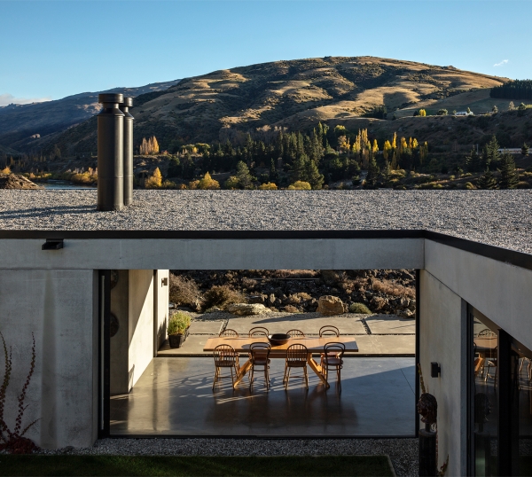 El techo está revestido con guijarros de río locales, integrando visualmente la casa dentro de su sitio y suavizando la transición de la forma construida a la natural.