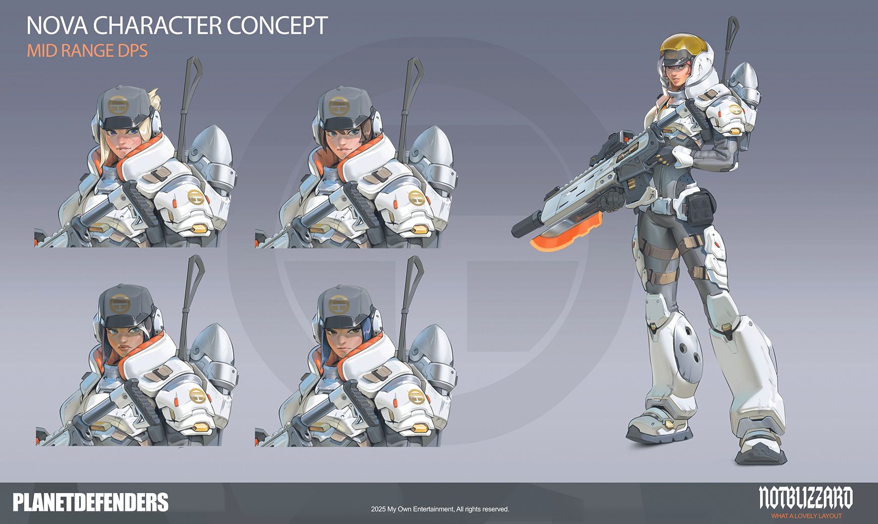 A partir de una sólida historia de fondo, se hace realidad el diseño futurista de Nova. También guió mis decisiones creativas para hacer que los personajes se sintieran más vivos. Al dibujar el personaje, empiezo dibujando contornos para intentar encontrar proporciones corporales y un lenguaje de formas que transmita su personalidad.