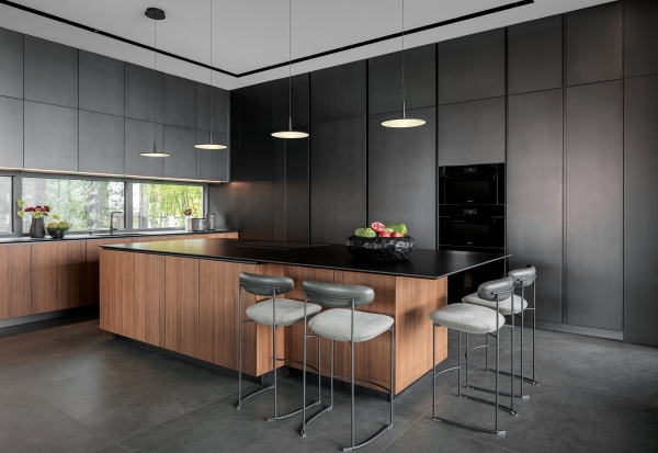 La cocina combina una elegante iluminación colgante con acabados táctiles para crear un espacio sofisticado y acogedor.