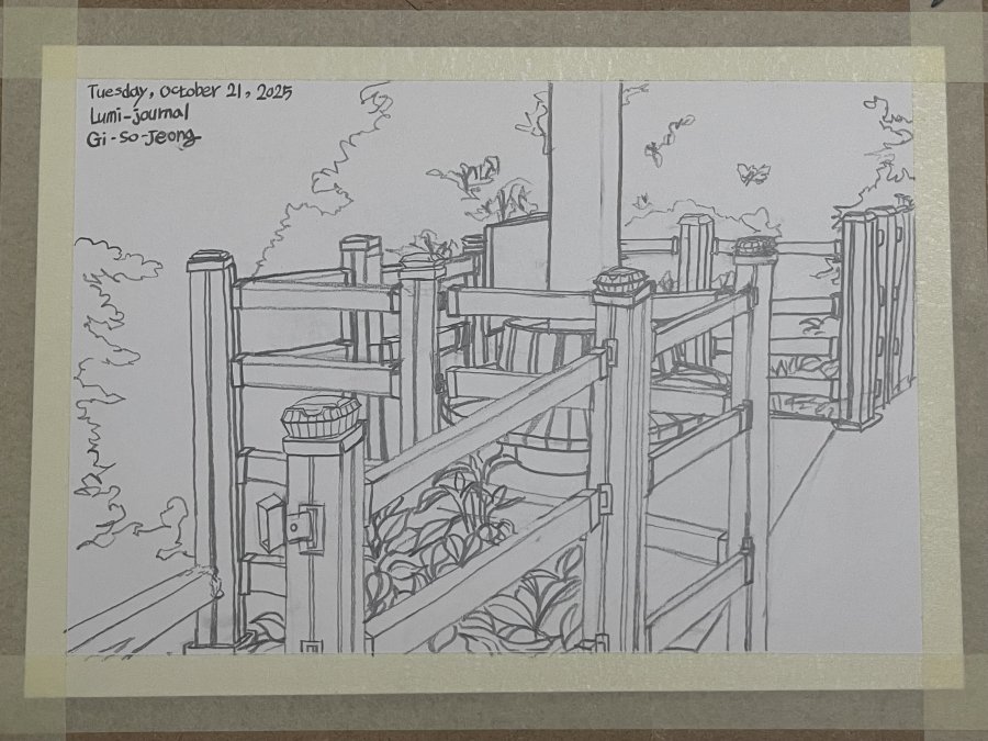 Desde lejos, las nubes se extienden horizontalmente, mientras que a la izquierda, densas nubes oscurecen el mundo. Los tonos suaves se mezclan para producir un color intenso que revela el mundo en tonos naturales, en contraposición al brillo brillante del verano. Como el aire es fresco, incluso los perros que caminan con sus dueños casi no tienen rocío en la nariz. Hoy en día, las flores amarillas son algo común, tanto cerca como lejos.
