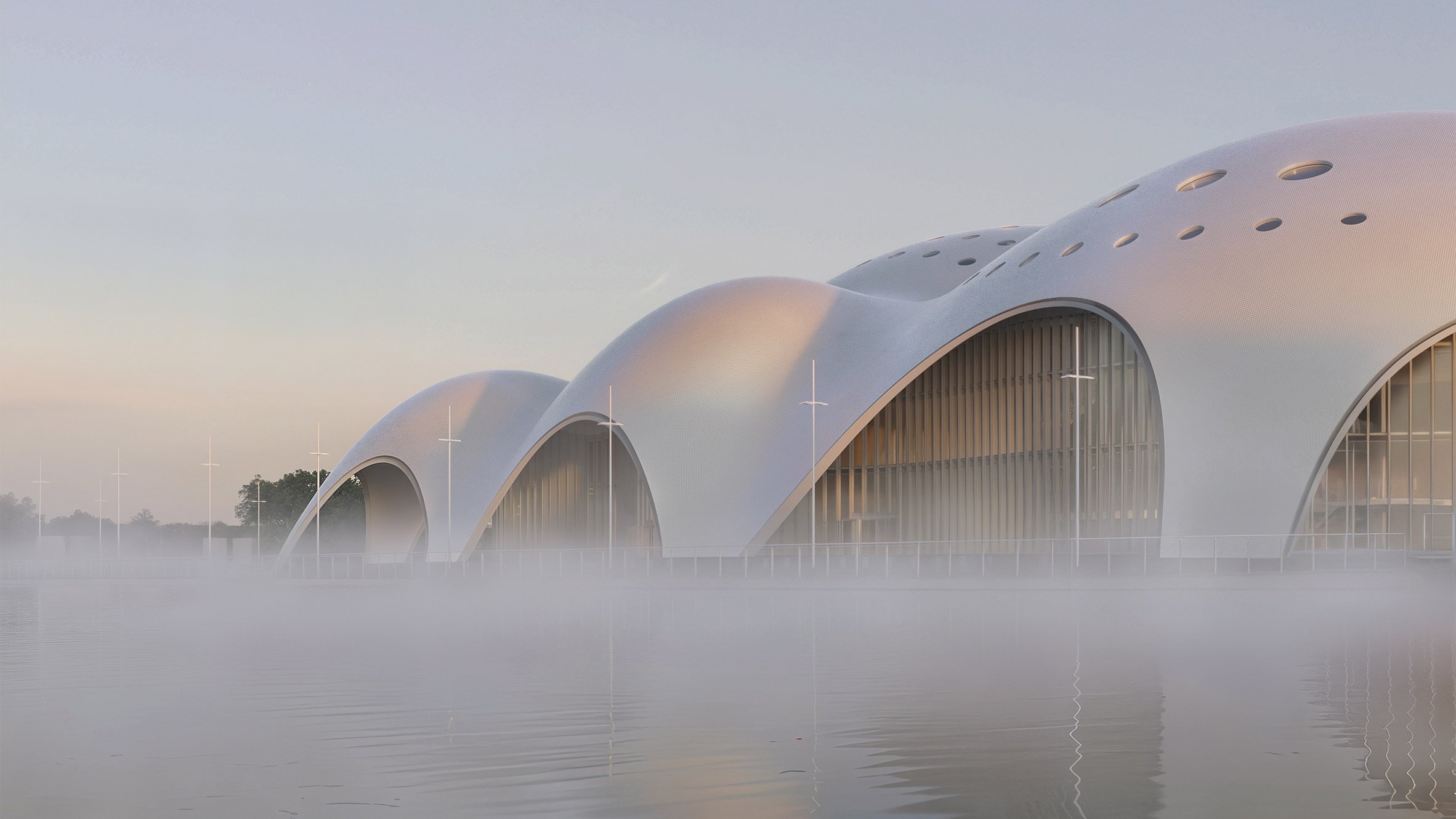 Inspirado en el color y el brillo del nácar, el techo curvo de hormigón del edificio estará revestido con tejas nacaradas.