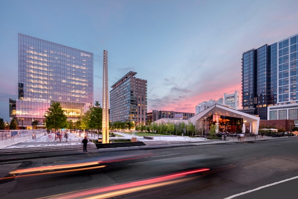 Una vista lateral exterior muestra las largas proporciones horizontales, las claraboyas y la transición de materiales del vidrio al aluminio.