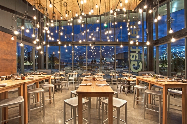 El espacio del restaurante sirve como ancla para la entrada, integrando la vida pública en el centro de innovación. La luz fluye a través de las paredes de vidrio, llenando los espacios interiores de reunión con transparencia y luz.