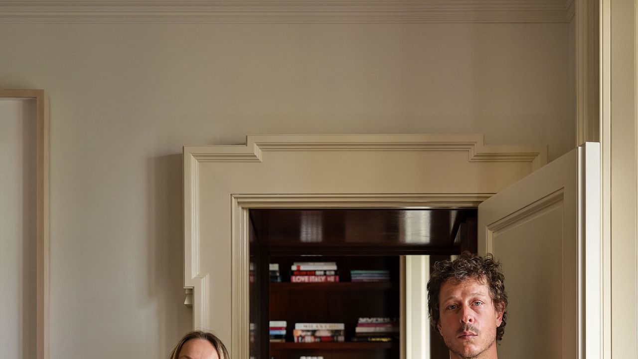 La transformación más dramática de la casa ocurre en el estudio/dormitorio adicional, ubicado entre la entrada con espejos y la soleada sala de estar de paredes blancas. Este último es amplio y luminoso, este espacio más pequeño revestido con paneles de madera de nogal que sube por las paredes y se curva hacia afuera en la cornisa, abrazando el techo con un cálido dosel revestido de madera. Cuando solo eran Sanderson y Ross, sirvió como biblioteca y sala de televisión, donde el arquitecto Massimiliano Locatelli puso sus pies sobre tres mesas de cóctel de latón y esmalte. Cuando los huéspedes pasan la noche, un banco incorporado se extiende hasta convertirse en lo que podría ser el diván más sofisticado jamás creado.