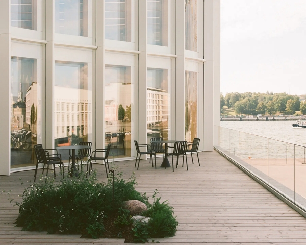 Se abren restaurantes, cafeterías y zonas de conferencias a nivel de calle para mejorar la permeabilidad e integrarse con el terraplén urbano.