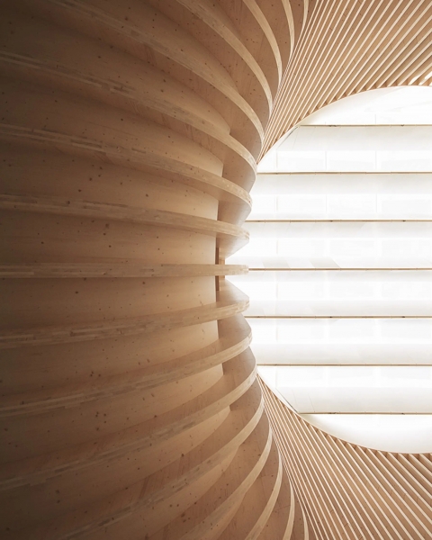 Un tragaluz circular característico corona el espacio del atrio y enmarca un gran banco de madera, haciendo referencia al espacio de reunión pública.