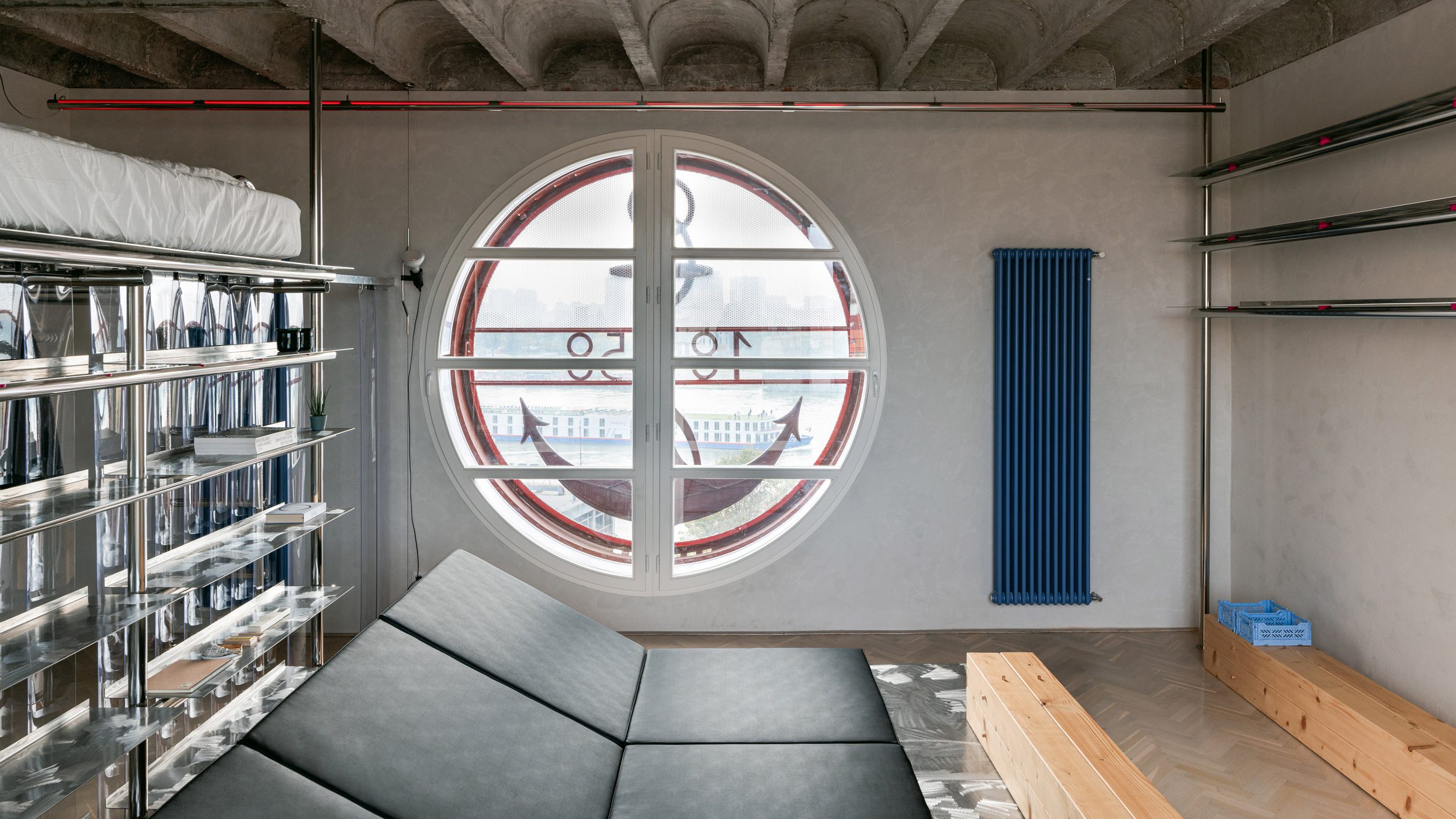Bancos de madera y más estructuras de acero se encuentran al fondo de la zona de día. La habitación también cuenta con dos radiadores de pared de color azul brillante a cada lado de la ventana, que junto con los conectores rosas brindan un toque de color audaz.
