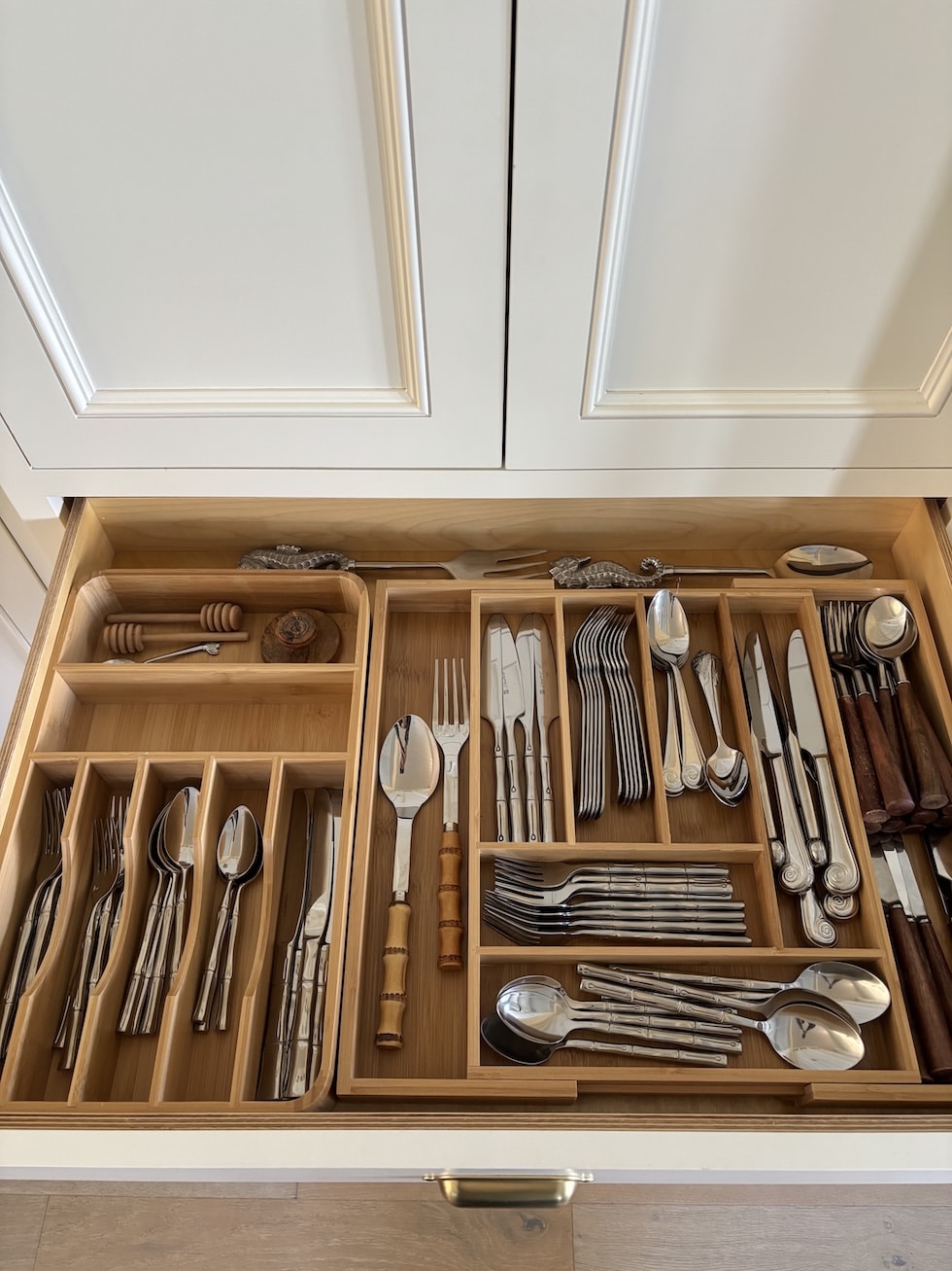 Pude maximizar el espacio de los cajones con varios cajones. Organizador de bambú.