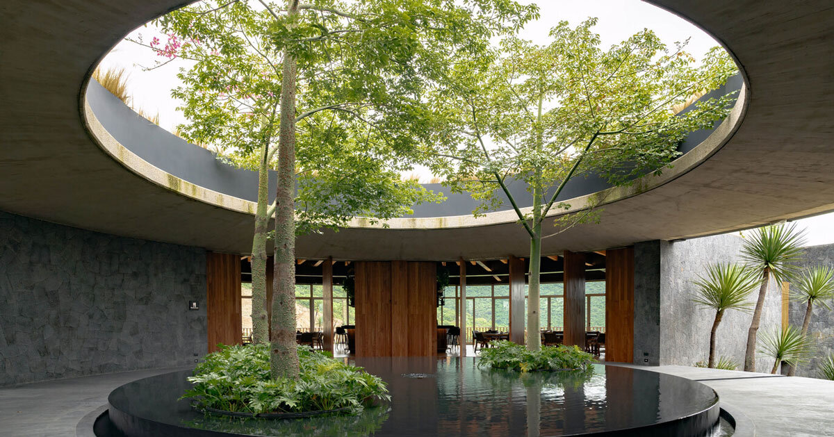 El anillo exterior está hecho de muros curvos de piedra de origen local que sobresalen de la pendiente, soportando la plataforma que alberga la mayor parte del programa y permitiendo que partes de la estructura queden parcialmente bajo tierra, aprovechando la pendiente natural de la ladera. El proyecto se aborda en los niveles del suelo y subterráneo, mientras que los paneles del techo actúan como plataformas de observación de 360 grados y cuentan con áreas de usos múltiples para eventos temporales. El corredor perimetral entre el anillo exterior y el segundo sirve como balcones y zonas de servicio. El segundo anillo presenta un muro cortina de vidrio que conecta el interior con el paisaje circundante y optimiza la luz natural. Finalmente, el tercer anillo, el más interior, está formado por puertas pivotantes de madera, que permiten abrir o cerrar el espacio al exterior según sea necesario. Un gran agujero circular en la losa de hormigón en el centro del edificio enmarca un elemento paisajístico elevado, marcando sutilmente la presencia de la estructura. Dedicado al alto Ezequiel Aguilar Martínez estudioUn aspecto fundamental del concepto arquitectónico fue mantener una escala que respetara su entorno, utilizando materiales que envejecieran con gracia, integrando el edificio perfectamente en su entorno natural.