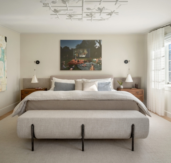 Un retiro tranquilo muestra obras de arte personales y sus tonos suaves realzan el ambiente del hogar al extremo.