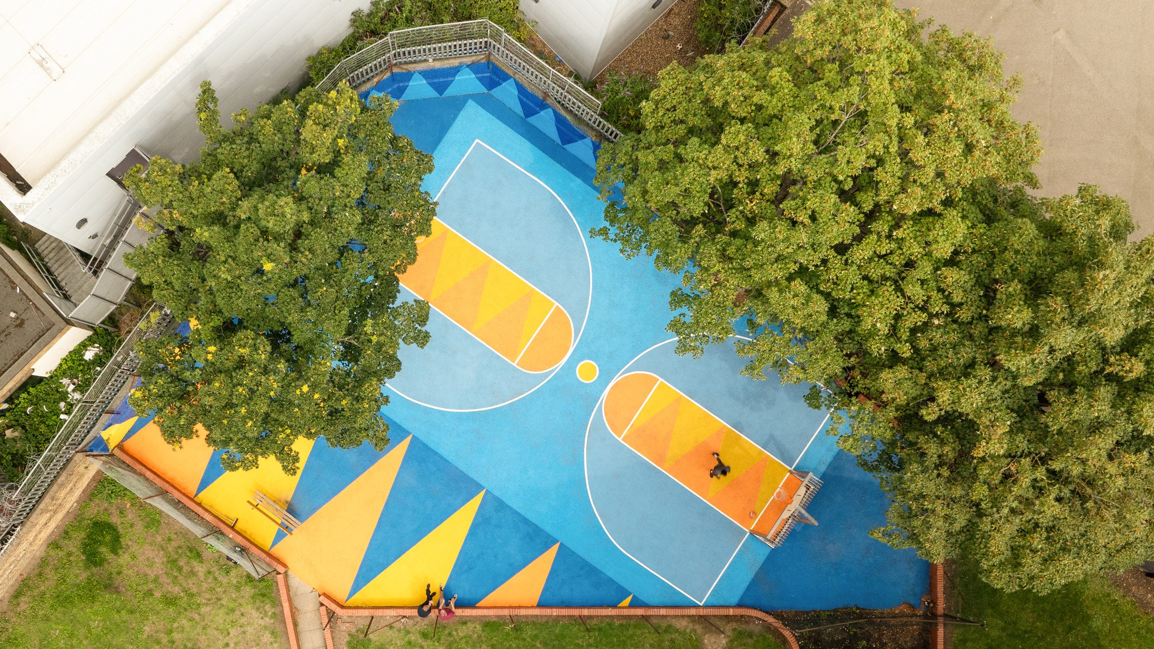 Colorida cancha de baloncesto diseñada por POOR Collective
